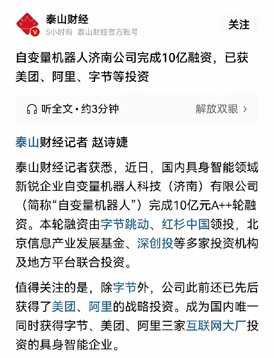济南自变量机器人,有可能是下一个宇树机器人。 前段时间自变量机器人(济南)公司完成了10亿融资,投资方有美团、阿里、字节等国内知名企业。 目前自变量机器人(济南)公司已经完成了近30亿元的融资。 自变量机器人成立于深圳,后来在济南开设分公司。但现在自变量机器人的主体已经改成了济南,因为自变量机器人(深圳)公司已经成了自变量机器人(济南)公司100%控股企业。而美团、阿里、字节投资的是济南公司。 主要是自变量机器人研究方向是具身智能机器人,也就是有自己智能的机器人,有可能是下一个宇树机器人。