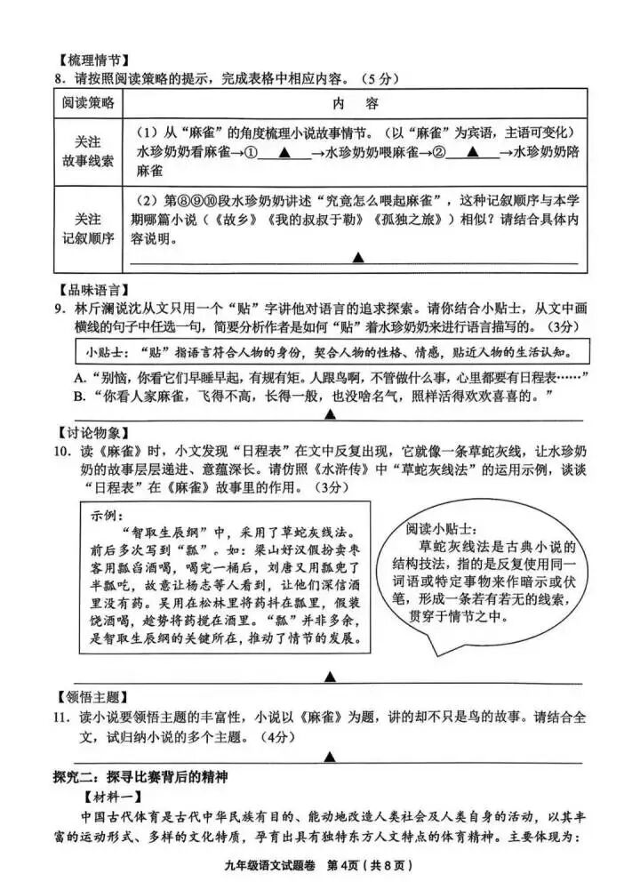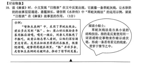 比如《麻雀》的题目中,有一道题问的是日程表在文章的作用,其实就是古典小说(如《水浒传》)中明线和暗线的技法。题干中,也会通过课内外结合的方式帮助学生去理解文章的技巧,背后一般都有对应的单元学习要求。