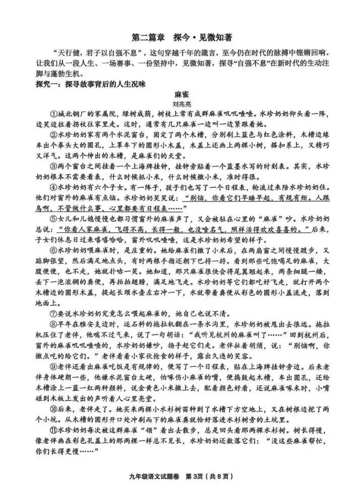 前段时间,杭州前媒体人、小小说作家刘兆亮,收到自己的文章《麻雀》入选金华市某地初三语文模拟卷的消息,整篇阅读理解出了四道题目,共15分。
