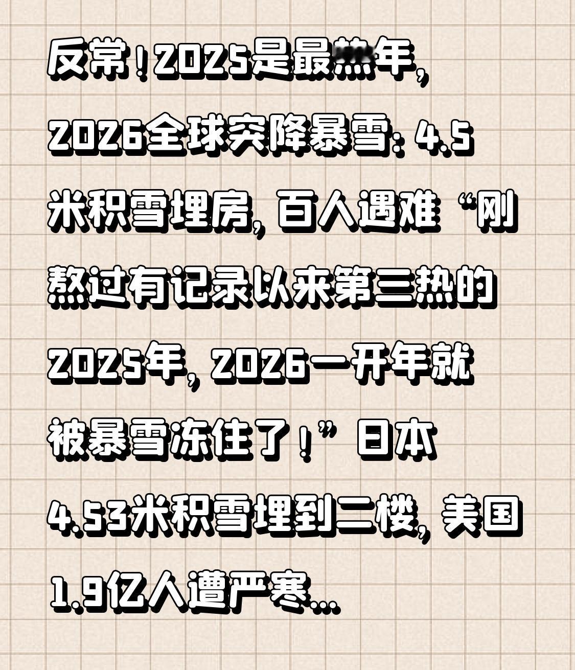 反常!2025是最热年,2026全球突降暴雪:4.5米积雪埋房,百人遇难 “刚熬过有记录以来第三热的2025年,2026一开年就被暴雪冻住了!” 日本4.53米积雪埋到二楼,美国1.9亿人遭严寒围困,俄罗斯积雪没过大腿,这场席卷全球的极端暴雪,看得人头皮发麻。 从亚洲到美洲,从欧洲到中亚,暴雪就像按下了“速冻键”。日本青森县的村民出门要在积雪中凿隧道,新潟县2.5米深的积雪把汽车埋成“雪馒头”,18天内42人遇难,七成是清雪时被屋顶积雪掩埋的老人。美国42个州遭风暴横扫,1.3万架航班取消,近百万用户停电,田纳西州的电线杆被冻成“冰柱”,纽约街头无家可归者在严寒中失去生命。俄罗斯莫斯科遭遇200年来最强降雪,60厘米积雪让城市停摆,堪察加半岛积雪超2.5米,直接进入紧急状态。 更揪心的是阿富汗,简易房屋被暴雪压垮,61人遇难,110人受伤,偏远村庄道路中断,救援车根本进不去。但灾难面前,总有暖流冲破冰封:四川甘孜零下20℃的国道上,民警跪冰刨雪3小时,徒手挖出被困私家车,路过群众主动加入救援,冻红的双手撑起生命通道;日本札幌市启动“暴雪特别配送”,年轻人给独居老人送餐送药,中国驻日使领馆成功救出6名被困同胞;莫斯科市民自发组成铲雪队,邻里互相帮忙清理屋顶积雪,在齐腰深的雪地里开出生路。 很多人疑惑:全球变暖为啥还会下这么大的雪?专家一句话点破真相:正是北极变暖削弱了极地涡旋,让冷空气疯狂南下,再加上海洋升温带来的充足水汽,才造就了这场“雪灾盛宴”。这不是矛盾,而是气候紊乱的信号——北半球暴雪肆虐时,南半球正遭遇40℃高温,同一颗星球“冰火两重天”。 从日本的“雪云列车”到美国的连环车祸,从民警跪冰救援到邻里守望相助,这场暴雪让我们看清:在自然伟力面前,人类如此渺小;但守望相助时,我们又如此强大。极端天气越来越频繁,或许这正是地球给我们的警示:保护环境从来不是一句口号,而是每个人的生存必修课。你那里下雪了吗?面对极端天气,你有哪些应对妙招?评论区分享一下~