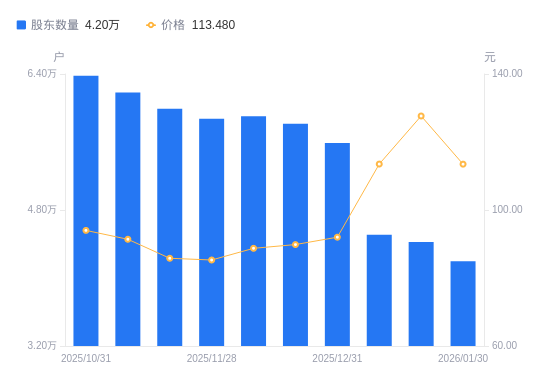 日期A股户数(户)流通A股户均持股数(股)户均持股市值(万元)2026-01-20442305000.1363.832026-01-09450934904.4455.672025-12-31558693958.4736.422025-12-19581533803.0034.162025-12-10590263746.7533.242025-11-28587323765.5132.122025-11-20599103691.4731.672025-11-10618333576.6632.692025-10-31637803467.4832.592025-10-20638023466.2832.03