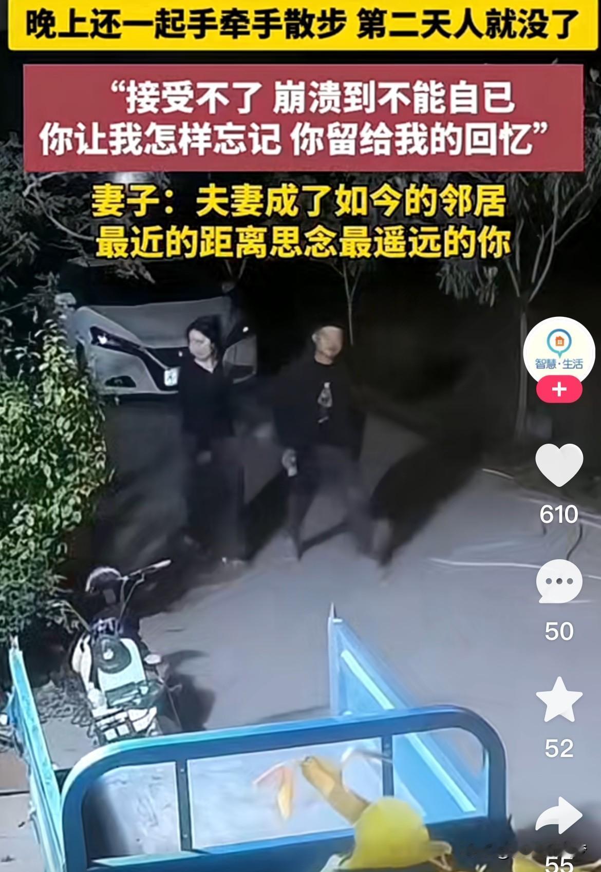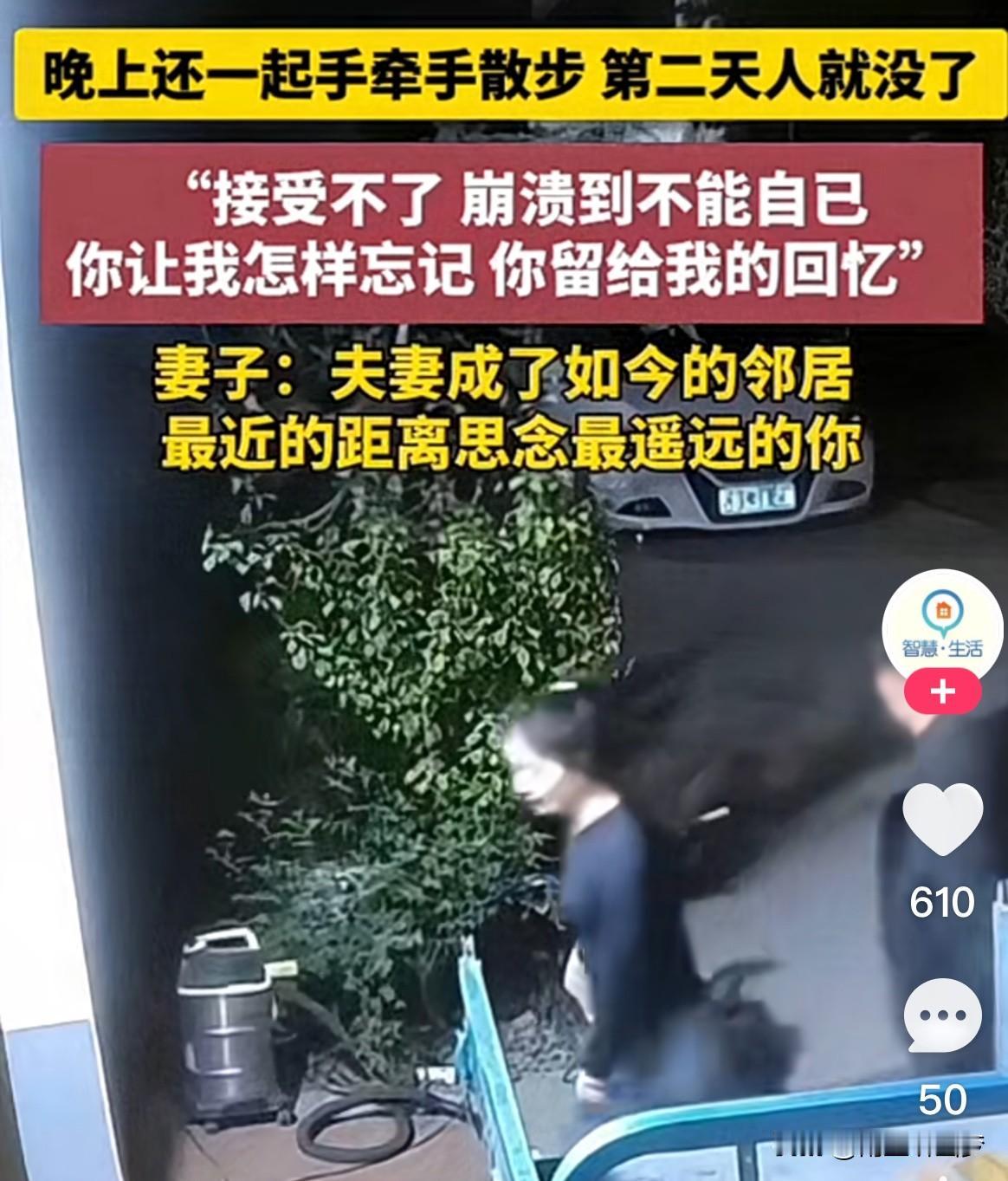 泪目!前一晚还牵着手散步,第二天人就没了……这种绝望,谁能懂? 刷到这条视频,心里猛地一揪。一对夫妻,像往常一样牵手散步,说说笑笑,转眼却已是生死相隔。妻子在镜头前哽咽:“接受不了,崩溃到不能自已……你让我怎么忘记你留给我的回忆?”而如今,夫妻成了“邻居”——一个在里头,一个在外头,最近的距离,却隔着最远的思念。 原来,“明天见”有时候,真的会变成再也见不到。 底下一条评论看得人鼻酸:“我老婆也是,回娘家睡了一觉,就再没醒过来。直到今天,我还在她的世界里活着,总想着余生能不能再找到她,重新照顾她,娶她回家。”字字没提痛,字字都是疤。还有人说:“生命有多长?不过一呼一吸之间。”是呵,我们总以为日子漫长,却忘了命运有时只给一瞬间的收场。 我们习惯了计划将来,却常常忘了,当下才是最值得紧握的“将来”。 那些为小事赌的气、为琐事冷的脸、为忙碌推掉的陪伴……在无常面前,忽然轻得像一阵烟。真正珍贵的,从来不是未来某天的“等我有空”,而是此刻手心的温度、眼前的笑脸、能拥抱的彼此。 不要等到只能隔着墓碑说话,才想起欠她他一个认真的拥抱。 珍惜眼前人,不是一句漂亮话,而是每一天的行动。 趁还来得及,回家好好吃顿饭,散步时紧紧牵住那只手,睡前认真说一句“我爱你”。把今天,当作最后的赠礼,用力去爱,用心去活。 你呢?有没有哪一瞬间,忽然意识到“眼前人”有多珍贵? 愿我们,都不留遗憾。