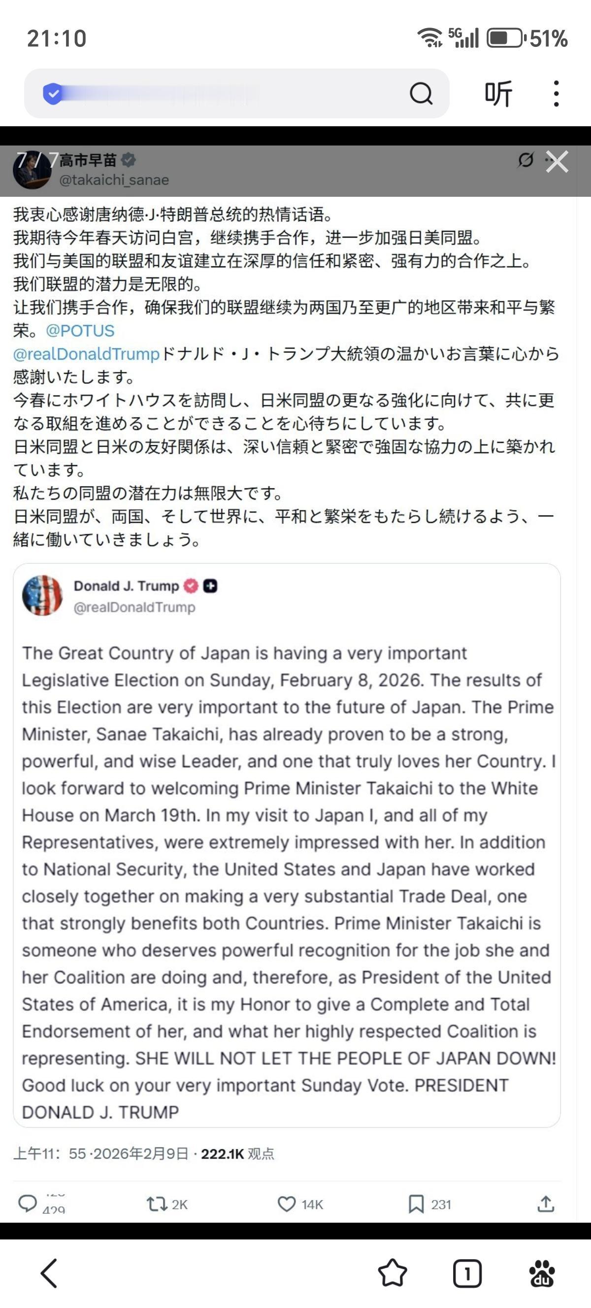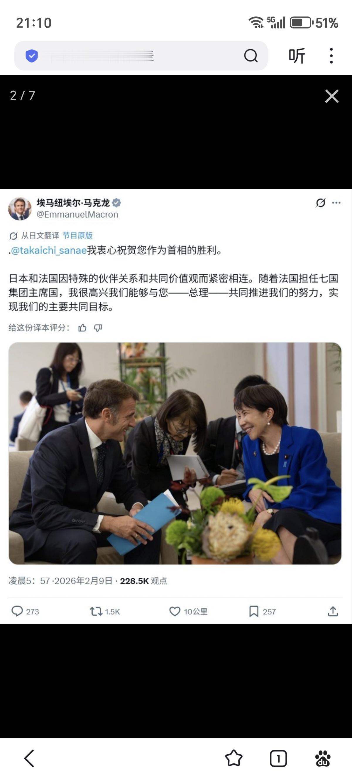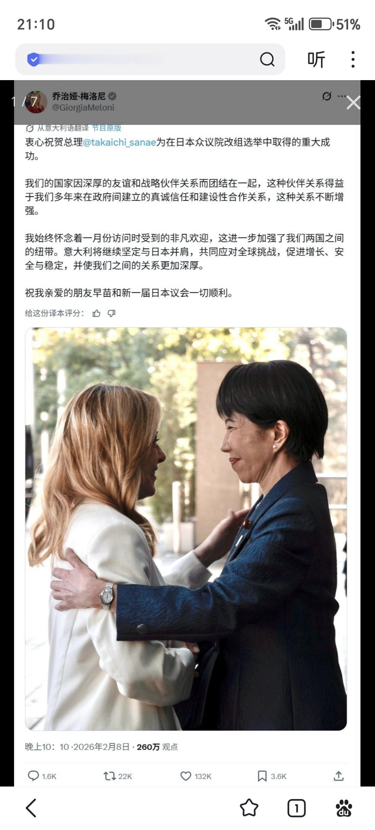 意大利总理梅洛尼、法国总统马克龙、韩国总统李在明、乌克兰总统泽连斯基、印度总理莫迪以及美国总统特朗普等均发文对高市早苗表示祝贺,尤其是马克龙还特意用了日语而没用法语,不过截至目前,高市早苗仅仅是对特朗普表示了感谢