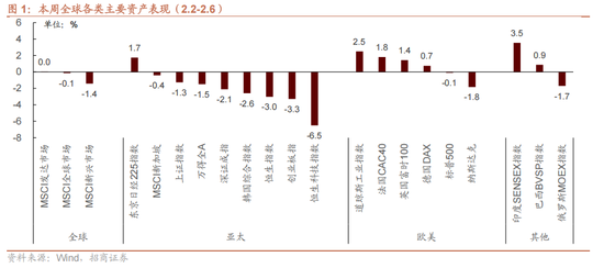 在1月30日特朗普宣布提名沃什为新一任联储主席后,对沃什可能偏鹰派货币政策的担忧冲击市场情绪,过去一周沃什交易成为市场主旋律,美元指数继续反弹,新兴股票市场重挫。具体来看,对海外流动性最为敏感的港股市场领跌,尤其恒生科技指数跌幅超过6%;相比之下欧洲股市、美股的道琼斯指数逆势上涨,而美股科技股跌幅居前。