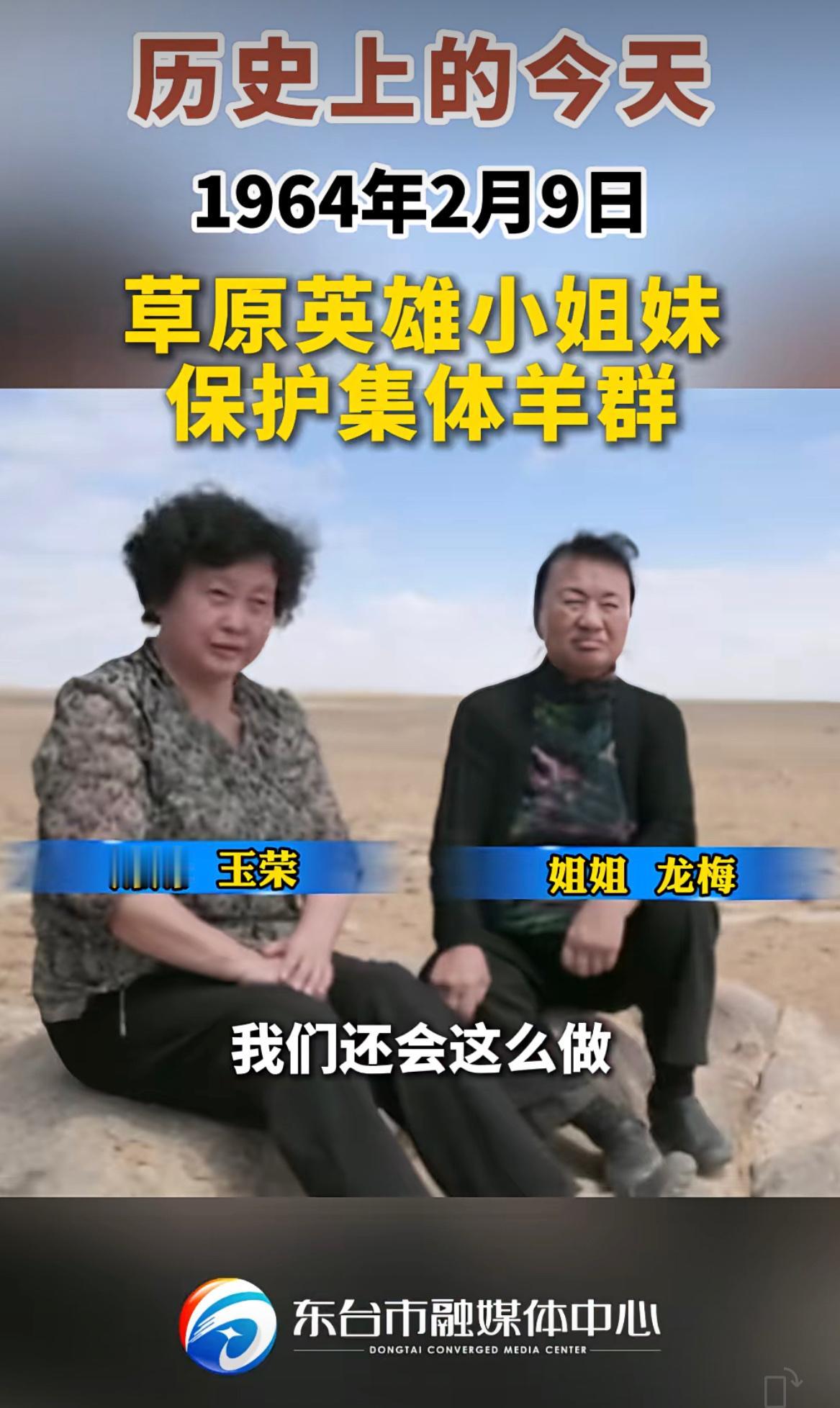历史上的今天:1964年2月9日,一场罕见的暴风雪降临内蒙古乌兰察布大草原,正在放牧的蒙古族小姐妹龙梅和玉荣与暴风雪搏斗了一天一夜,舍生忘死地保护集体的384只羊,因为冻伤严重,落下了终身残疾。 历史上的今天