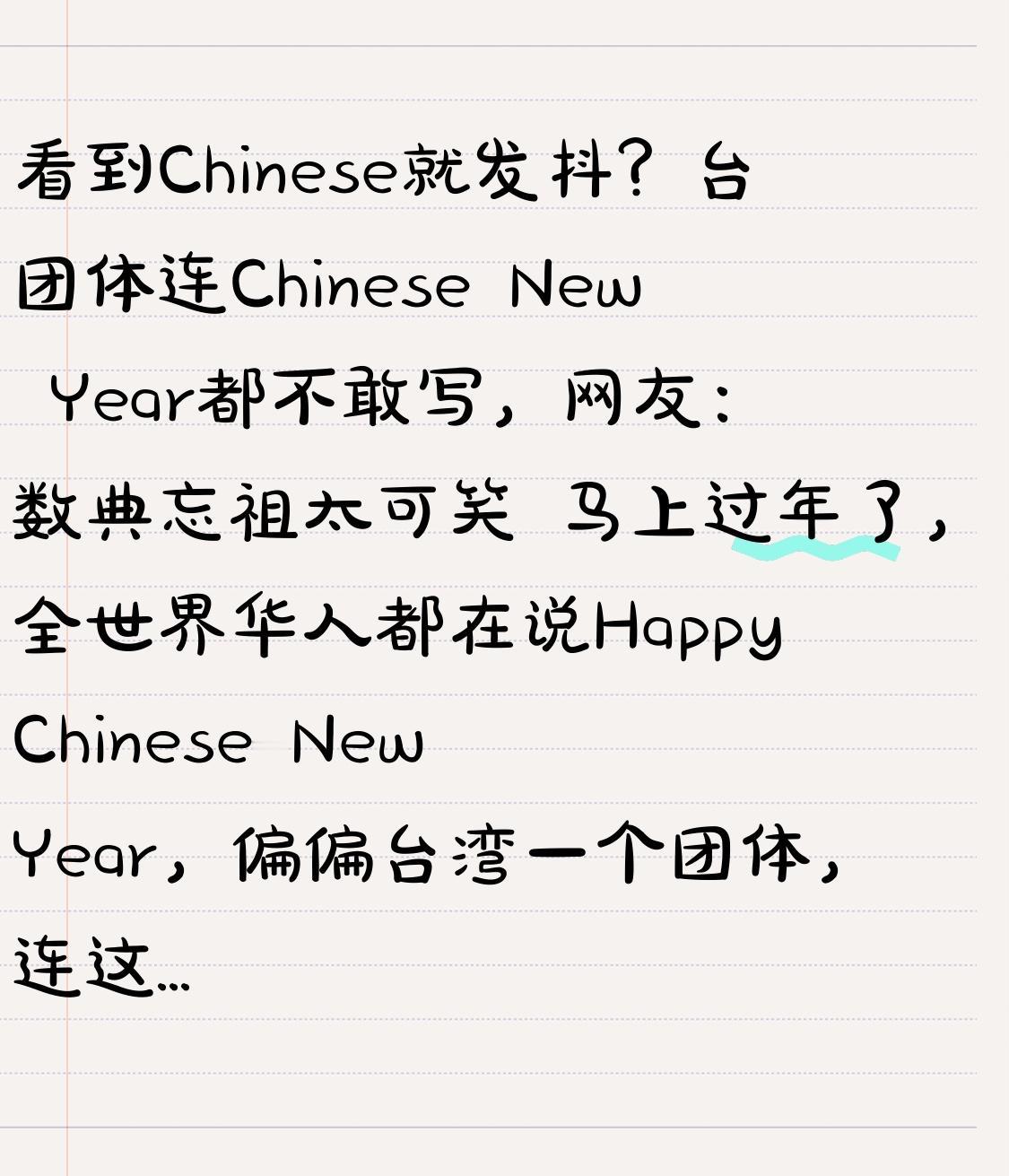 看到Chinese就发抖?台团体连Chinese New Year都不敢写,网友:数典忘祖太可笑 马上过年了,全世界华人都在说Happy Chinese New Year,偏偏台湾一个团体,连这几个英文单词都不敢用!一边挂着“中华文化”的招牌,一边把春节英文名偷偷改成Lunar New Year,刻意删掉Chinese,这波操作直接让全网炸锅:连自己的根都不敢认,到底在怕什么? 最近,台“中华文化总会”宣传春节活动,英文全程写Lunar New Year,绝口不提Chinese New Year。要知道,这个团体名字里明晃晃带着“Chinese Culture”,嘴上喊着传承文化,行动上却拼命抹掉“中国”痕迹,简直自打耳光。 有人辩解,说Lunar New Year是国际通用,没必要较真。可明白人都清楚,春节起源于中国,是老祖宗传了几千年的节日,Chinese New Year才是根正苗红的官方叫法,全球华人都认。 更讽刺的是,之前台湾好市多标了Chinese New Year,被少数人攻击“统战”,商家立马改词认怂;现在连文化团体都跟风避讳,看到Chinese就敏感,说到底就是“去中国化”的小动作,把文化传统当成政治工具。 岛内民众也看不下去,纷纷怒斥:春节是中国人的节日,堂堂正正说Chinese New Year不丢人,刻意回避才是数典忘祖。连自己的文化根脉都要切割,连一句正确叫法都不敢说,这不是包容,是自卑又可笑。 其实不管名字怎么改,春节的根永远在中国,团圆、祭祖、守岁的习俗,刻在每一个华人的骨子里,改得了文字,改不了血脉。 文化从来不是政治的筹码,越是刻意回避,越显得心虚;越是割裂传统,越丢了体面。两岸同胞同根同源,春节是我们共同的节日,堂堂正正说Chinese New Year,才是对文化最基本的尊重。 马上过年了,你一定会说Chinese New Year,对不对?评论区打出祝福,让他们看看,中华文化从来都改不了、割不断!