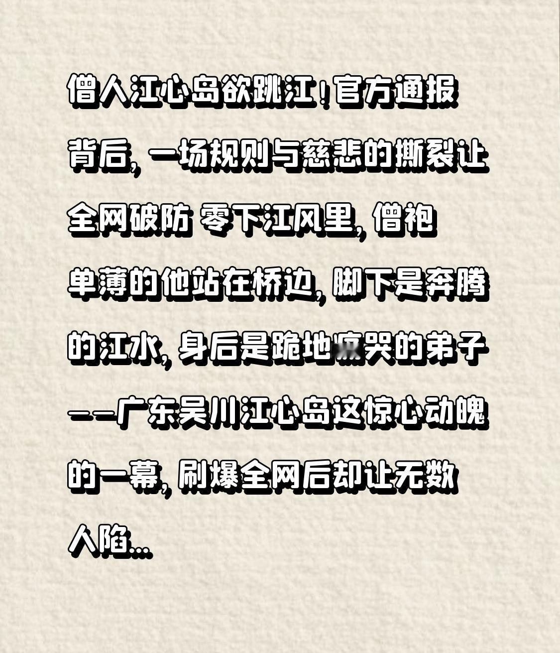 僧人江心岛欲跳江!官方通报背后,一场规则与慈悲的撕裂让全网破防 零下江风里,僧袍单薄的他站在桥边,脚下是奔腾的江水,身后是跪地痛哭的弟子——广东吴川江心岛这惊心动魄的一幕,刷爆全网后却让无数人陷入沉默:本该四大皆空的修行者,为何会被逼到跳江绝境?官方通报一出来,真相远比想象中更复杂。 2月4日晚8点,江心岛的夜色被一阵哭喊打破。44岁的僧人释静觉(法号)紧抓路灯杆,半个身子探向江面,身旁尼姑急得发抖,路人纷纷上前劝说,民警火速赶到将他拉回安全地带。这段视频很快发酵,网友给他起了个充满悲悯的名字“扶灯法师”,大家都在追问:到底是什么让他放弃信仰,选择轻生? 就在全网心疼声一片时,官方通报揭开了另一面:释静觉并非备案宗教教职人员,2021年剃度出家后,因违反寺庙管理规定,2024年被回归寺依规“迁单”(驱逐) 。2026年1月,他要求重返寺庙被拒,多次沟通无果后,才走到了跳江这一步。可通报刚出,网传的一封遗书又让事件反转:信中字字泣血,控诉自己遭排挤逼迫,被赶出后只能栖身破败小庵,身患糖尿病却无钱买药,连避雨的地方都没有,手机草稿箱里还存着“再下暴雨没地方住怎么办”的绝望。 一边是寺庙“依规办事”的冰冷通告,罗列着他“对抗僧团、谩骂师父”的罪状;一边是老僧无家可归、走投无路的血泪控诉,网友瞬间分成两派:有人说“无规矩不成方圆,违规就该受罚”,也有人痛斥“佛门本应慈悲为怀,怎能对同门赶尽杀绝”。更戳心的是,他栖身的小庵早已被划入拆迁范围,寺庙不收、居所将拆,双重压力把这个修行者逼到了绝境。 如今官方确认释静觉身体健康无碍,但这场风波留下的拷问,却萦绕在每个人心头。佛门清净地,到底该以规矩为上,还是以慈悲为先?寺庙按章办事没错,可当制度的冰冷撞上个体的绝境,是否少了一丝人情味? 其实网友争论的从来不是谁对谁错,而是怕看到“规矩之下,无人容身”。就像有人说的:“规则是底线,但慈悲才是底色。” 这个世界需要秩序,可更需要温度——无论是寺庙对同门的包容,还是社会对边缘人的兜底,多一份体谅,少一份冷漠,或许就不会有人被逼到绝境。 修行者求的是内心安宁,我们普通人盼的,不过是“绝境之中有人拉一把”。如果你是寺庙管理者,会如何处理?欢迎在评论区聊聊,愿每个走投无路的人,都能遇到愿意为他“扶灯”的人。
