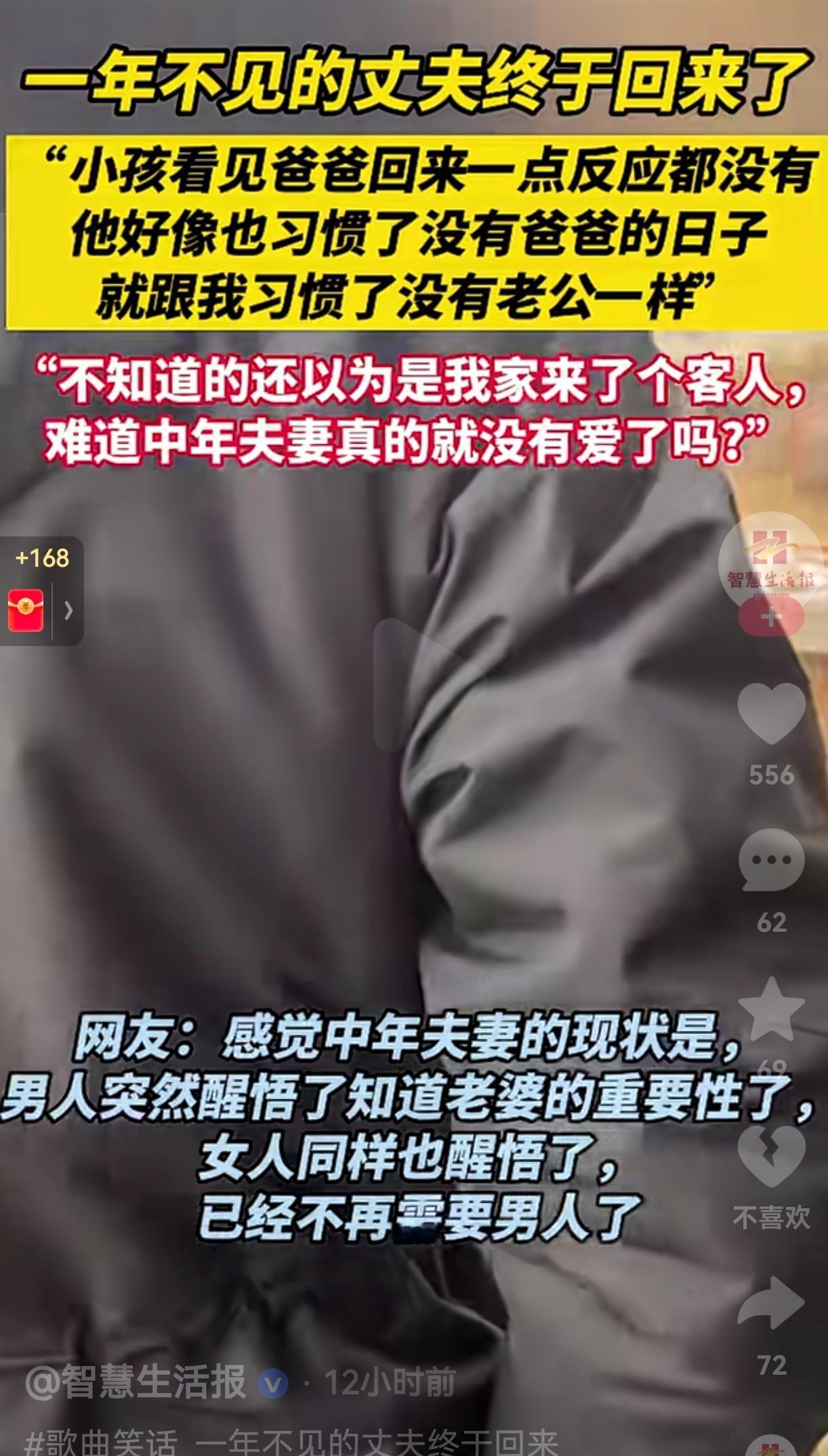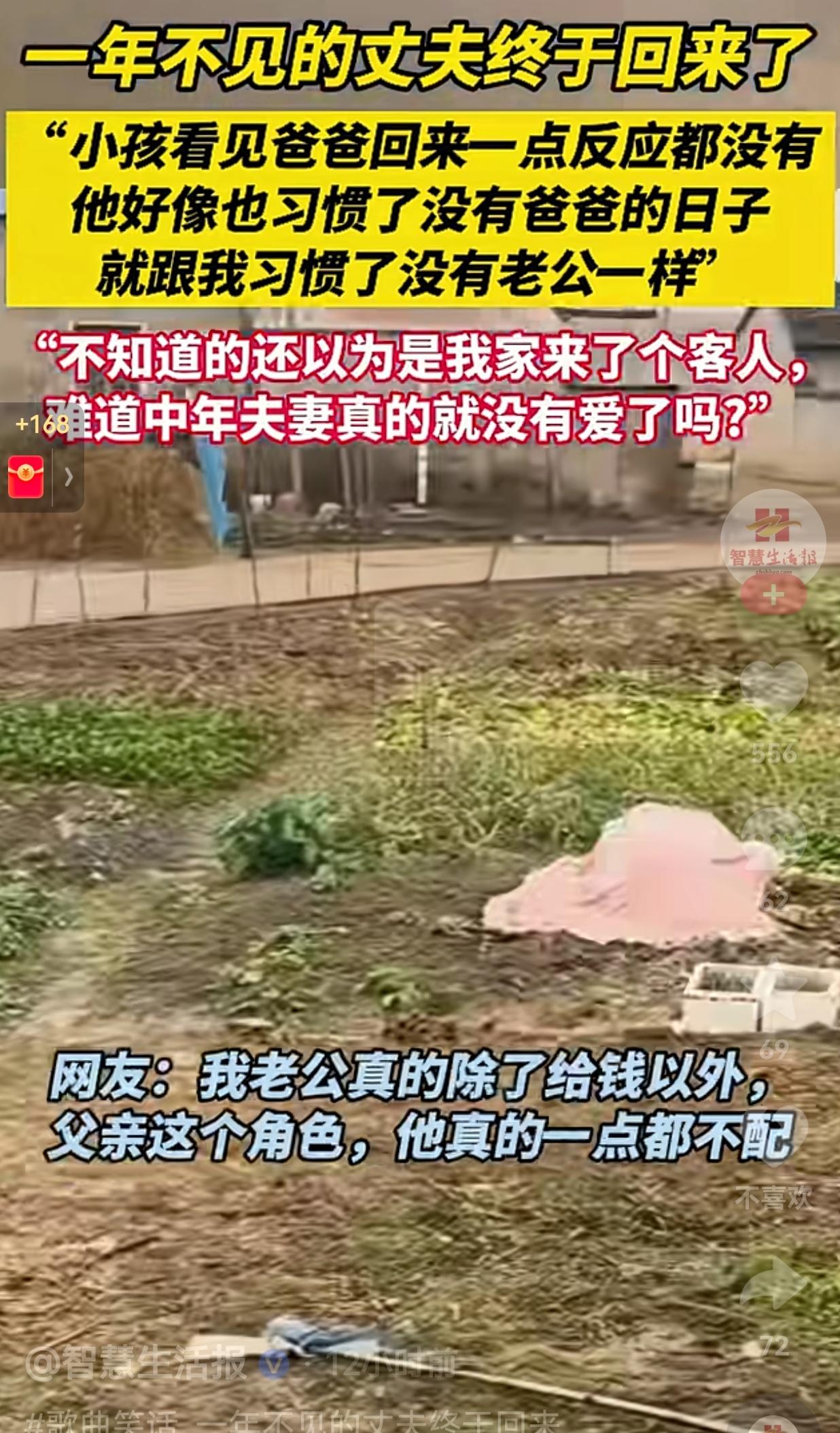 太扎心了!快过年了,一年没见的丈夫,终于拖着行李箱回来了。 他风尘仆仆,带着一身的疲惫和给家人的礼物,可是,等他下车的那一刻,却没等来预想中的拥抱和欢呼。 孩子只是抬头看了一眼,没有过来迎接爸爸,又低下头继续玩着手里的玩具,连一声“爸爸”都没喊,感觉就像家里来了个陌生人似的。 而他的妻子在一旁苦笑:“他好像已经习惯了没有爸爸的日子,就跟我习惯了没有老公一样。” 不知道的,还以为这是个普通的访客。可这是孩子的亲爹,是她的丈夫啊。 而网友的评论,既扎心,又很现实。有的网友说:“三分钟热度,刚回来很亲,要不了一天,天天吵。” 也有的网友说:“人到中年不谈感情,别的不说,带多少钱回来才是真。” 还有的网友说:“感觉中年夫妻的现状是,男人突然醒悟了知道老婆的重要性了,女人同样也醒悟了,已经不再需要男人了。” 其实啊,妻儿表现得如此淡定不是孩子冷漠,也不是妻子无情,而是缺席的时间,真的会把亲情和爱意磨成陌生。 孩子的世界很简单,谁陪他吃饭、陪他睡觉、陪他玩玩具,他跟谁就最亲。 爸爸一年到头在外打拼,错过了他第一次换牙、第一次自己穿衣服、第一次在幼儿园受委屈,等再回来时,在孩子眼里,这个男人就只是个“会给我买玩具的叔叔”。 而妻子呢?她一个人扛着家里的柴米油盐,孩子生病时她独自抱着去医院,夜里哄睡完孩子还要收拾家务,连个搭把手的人都没有。 久而久之,她早就练就了“一个人活成一支队伍”的本事,老公回来,反而像个“需要被照顾的客人”,而不是那个能并肩扛事的伴侣。 这件事情说到底,婚姻和亲情从来不是靠“一年见一次”来维系的。钱能买来礼物,却买不来孩子的一句“爸爸”;能撑起生活的体面,却撑不起缺席的陪伴。 快过年了,那些在外奔波的爸爸们,别总想着“赚够钱就回家”,有时候多给老婆孩子打几个视频电话,多问问孩子今天吃了什么,多跟妻子说一句“你辛苦了”,口头上的关心,也很有用。 对此,你怎么看?欢迎评论区唠唠。