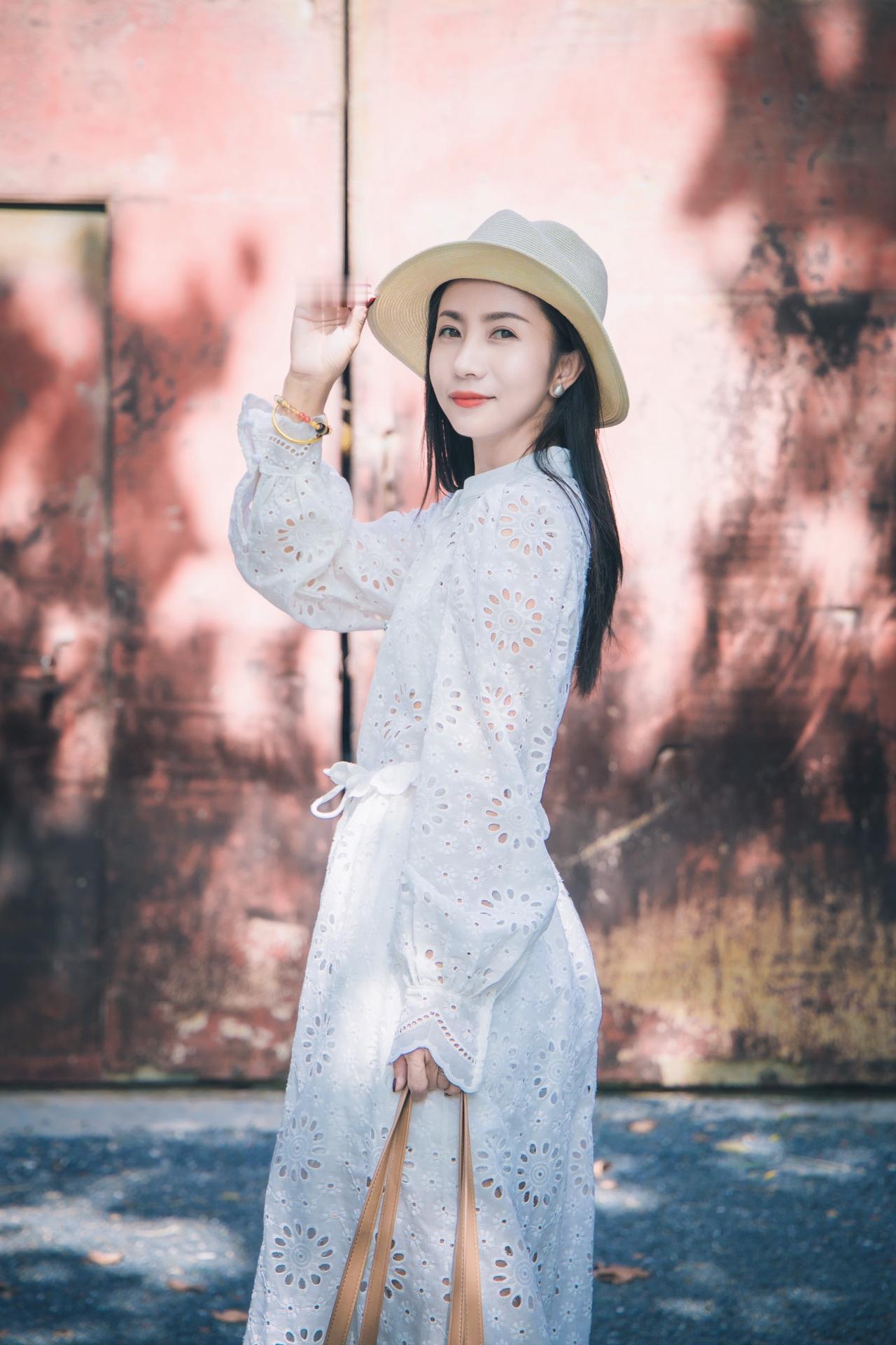 甜美少女风,红色蕾丝连衣裙,都市街拍,微笑动人