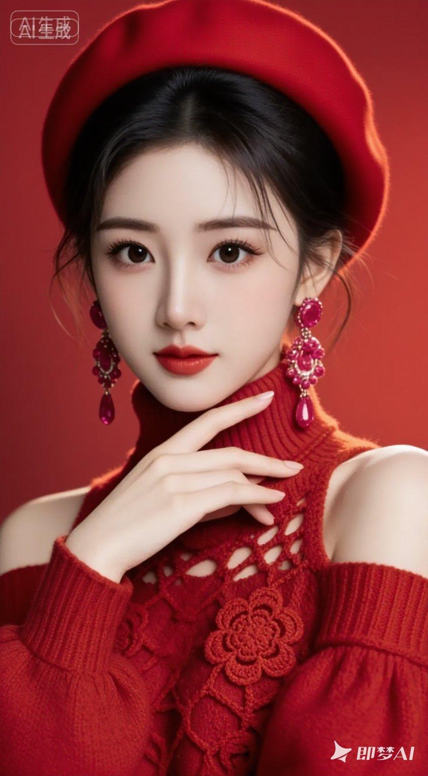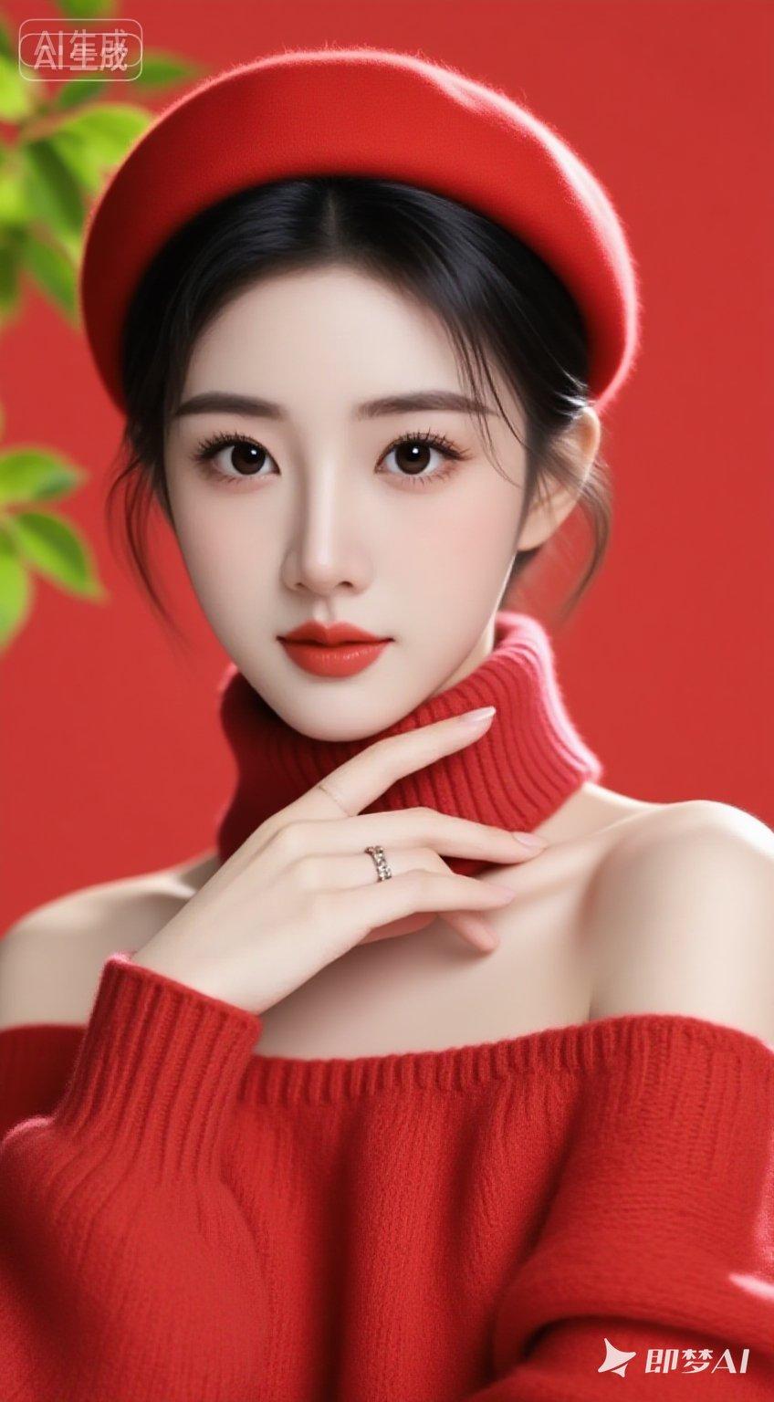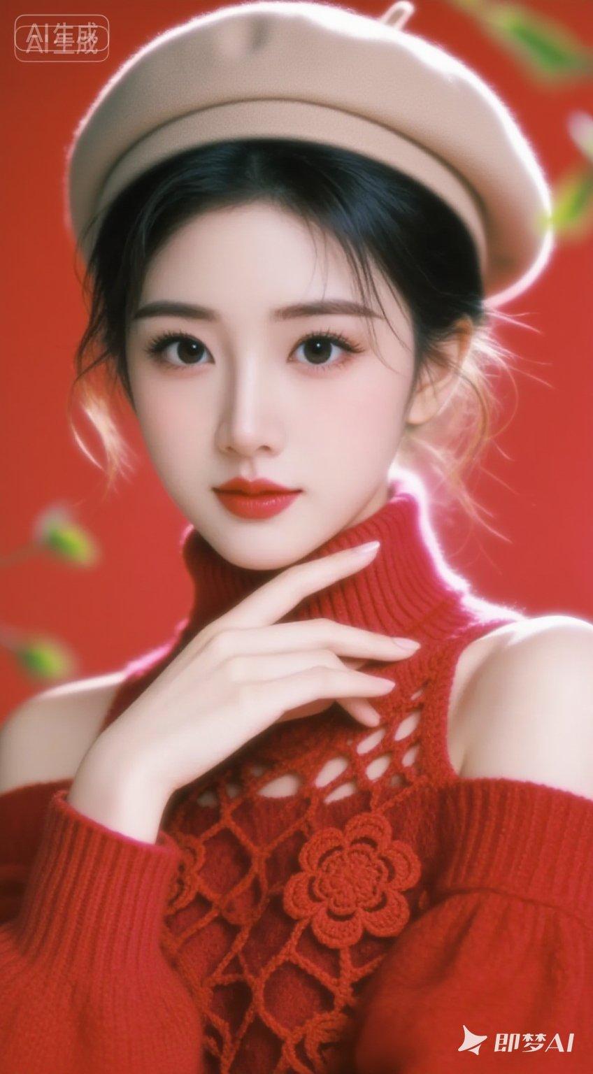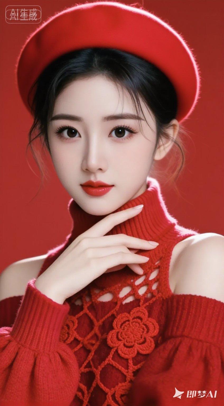 22岁,肤白貌美,冷白皮,鹅蛋脸,气质优雅端庄的美女,身着红色柔软露肩毛衣,鲜艳红色镂空围巾宽松柔美头戴镂空贝雷帽,高盘发,微乱,发丝边缘有光,精致的面容,大眼,睫毛,眼睛高细节,回眸一笑百媚生,皮肤白皙细腻