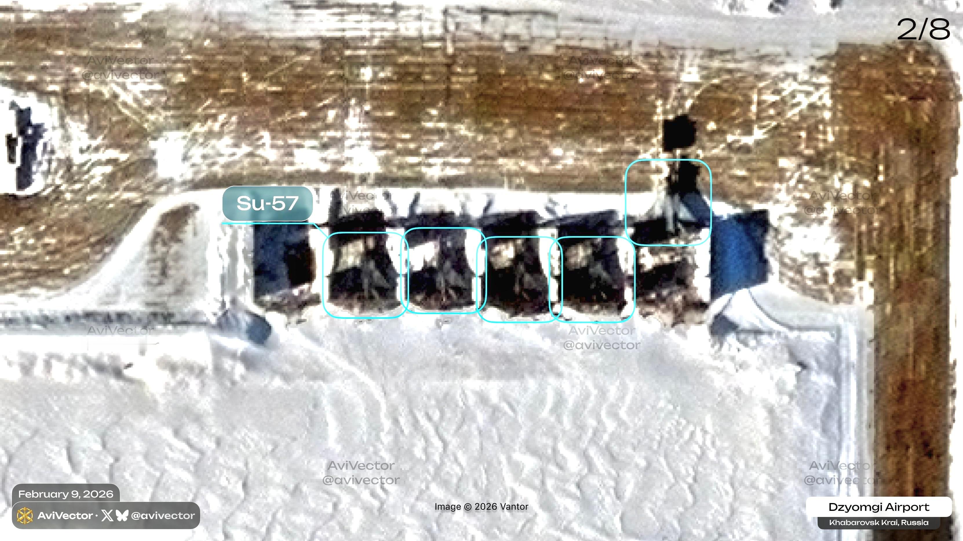 热点解读 最新的卫星图显示,俄罗斯远东地区共青城机场的停机坪上停放的各种战机中包括15架Su-57。