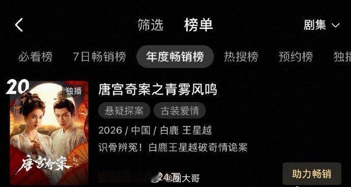 白鹿唐宫奇案拉新年榜TOP20白鹿《唐宫奇案》的热度也太绝了吧,新剧刚开播不到一周,就登优酷拉新年榜了,目前排在第20名。看得出来白鹿和王星越的剧粉盘很牛了,李佩仪这个老公姐,要在开年slay咱们观众了啊!白鹿唐宫奇案登优酷拉新年榜