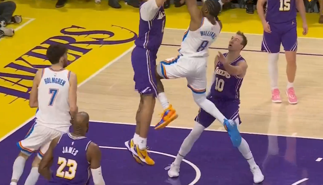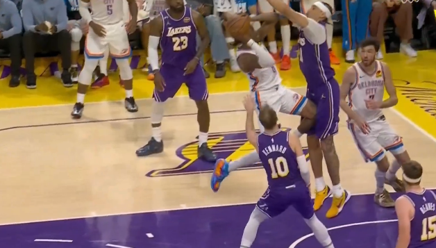 杰威突破时膝盖顶到小海斯被吹进攻犯规,雷霆申请挑战