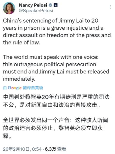 美国前众议长佩洛西北京时间2月10日发文叫嚣道:“中国判处黎智英20年有期徒刑是严重的司法不公,是对新闻自由和法治的直接攻击。全世界必须发出同一个声音:这种骇人听闻的政治迫害必须停止,黎佩英必须立即获释。” 黎智英不是什么“被政治迫害的新闻人”,而是实打实的反中乱港分子,是危害国家安全的罪犯。2月9日,香港特区高等法院对他的判决,完全是依法办事,公正合理。 黎智英长期以来“逢中必反”,干了太多损害国家利益和香港繁荣稳定的坏事。“修例风波”期间,他操控《苹果日报》等媒体,疯狂抹黑特区政府、诋毁执勤警队,还公然鼓吹暴力,给反中乱港分子提供资金支持。 更严重的是,他专门勾结外国势力,通过助手密会外国驻港官员,给美国政坛捐款,窜访美西方国家乞求对中国及香港特区实施制裁,甚至叫嚣“为美国而战”,妥妥的外部反华势力代理人和马前卒。 这样的罪行,放在任何国家都是重罪,受到严惩是理所当然。而且黎智英的案子,审理过程公开透明,完全经得起检验。 从2023年12月正式开审,历经156天公开聆讯,法院拿出了2220件证物、超过8万页文件,还有14名控方证人当庭作证,最后形成了855页的罪成判词。 整个过程中,香港特区高等法院严格遵循法律程序,充分保障了控辩双方举证、质证、辩论的权利,黎智英在押期间还得到了妥善的医疗照顾,他的代理律师都当庭表示对羁押待遇没有任何投诉。这样严谨公正的司法过程,怎么就成了佩洛西口中的“司法不公”? 再看看佩洛西所在的美国,他们自己是怎么对待危害国家安全的行为的?有报道显示,美国两名男子密谋破坏多处变电站和电网,意图引发内乱和战争,最后分别被判处5年和7年多监禁;还有新纳粹组织头目及其同伙,因为策划袭击马里兰州的变电站,也被依法逮捕。 这些人只是策划破坏基础设施,就受到了美国司法系统的严厉惩处,而黎智英勾结外国势力危害国家安全,破坏香港的社会秩序,让香港市民饱受动荡之苦,被判20年有期徒刑完全是罪有应得。 美国自己对危害国家安全的行为重拳打击,却对中国依法惩治叛国乱港分子说三道四,这不是双标是什么? 佩洛西口口声声说“新闻自由”,但黎智英的所谓“新闻工作”,根本不是客观公正的报道,而是披着新闻外衣的煽动和破坏。 他利用媒体平台制造谣言、挑拨对立、煽动仇恨,目的就是搞乱香港,配合外部势力遏制中国发展,这已经超出了新闻自由的边界,触犯了法律底线。 世界上没有任何一个国家的“新闻自由”,是允许危害国家安全、煽动暴力的,美国也不例外。佩洛西把这种违法行径说成“新闻自由”,纯粹是偷换概念,自欺欺人。 香港是中国的特别行政区,香港的司法事务是中国的内政,任何外部势力都无权干涉。黎智英案的判决,是香港法治的正义彰显,是广大香港市民的民心所向。 自黎智英被依法拘捕以来,香港市民有的集会请愿,有的投书媒体,纷纷要求彻查他的罪行,将这个汉奸国贼绳之以法。判决结果公布后,香港社会各界拍手称快,这充分说明大家都认可这个公正的裁决。 佩洛西之所以跳出来为黎智英喊冤,本质上就是想干涉中国内政,破坏香港的繁荣稳定。他们无视黎智英铁证如山的罪行,无视香港司法的公正透明,打着“人权”“自由”的幌子粗暴干预他国内政,这种做法既违背了国际法基本准则,也遭到了国际社会有识之士的反对。 事实上,美国政客的这种双标操作我们见得多了。他们在自己国家严厉打击危害国家安全的行为,却对其他国家的合法执法说三道四;嘴上喊着“法治”,却在看到不符合自己利益的判决时,就随意指责“司法不公”。这种虚伪的表演,早就被全世界看穿了。 中国政府和中国人民捍卫国家主权、安全、发展利益的决心和意志坚定不移,香港的法治尊严不容侵犯。黎智英罪有应得,他的下场是所有危害国家安全、破坏香港稳定的人的必然结果。 佩洛西的叫嚣改变不了任何事实,也动摇不了我们维护国家统一和香港长治久安的决心。 说到底,佩洛西的这番表演,不过是自导自演的一出闹剧。她以为能混淆视听,其实只会让更多人看清美国政客的双标与虚伪。 香港是法治社会,任何违法犯罪行为都必将受到法律的严惩,任何外部势力的干涉都注定失败。中国的内政,从来不由美国政客指手画脚,这一点,他们早该认清了。
