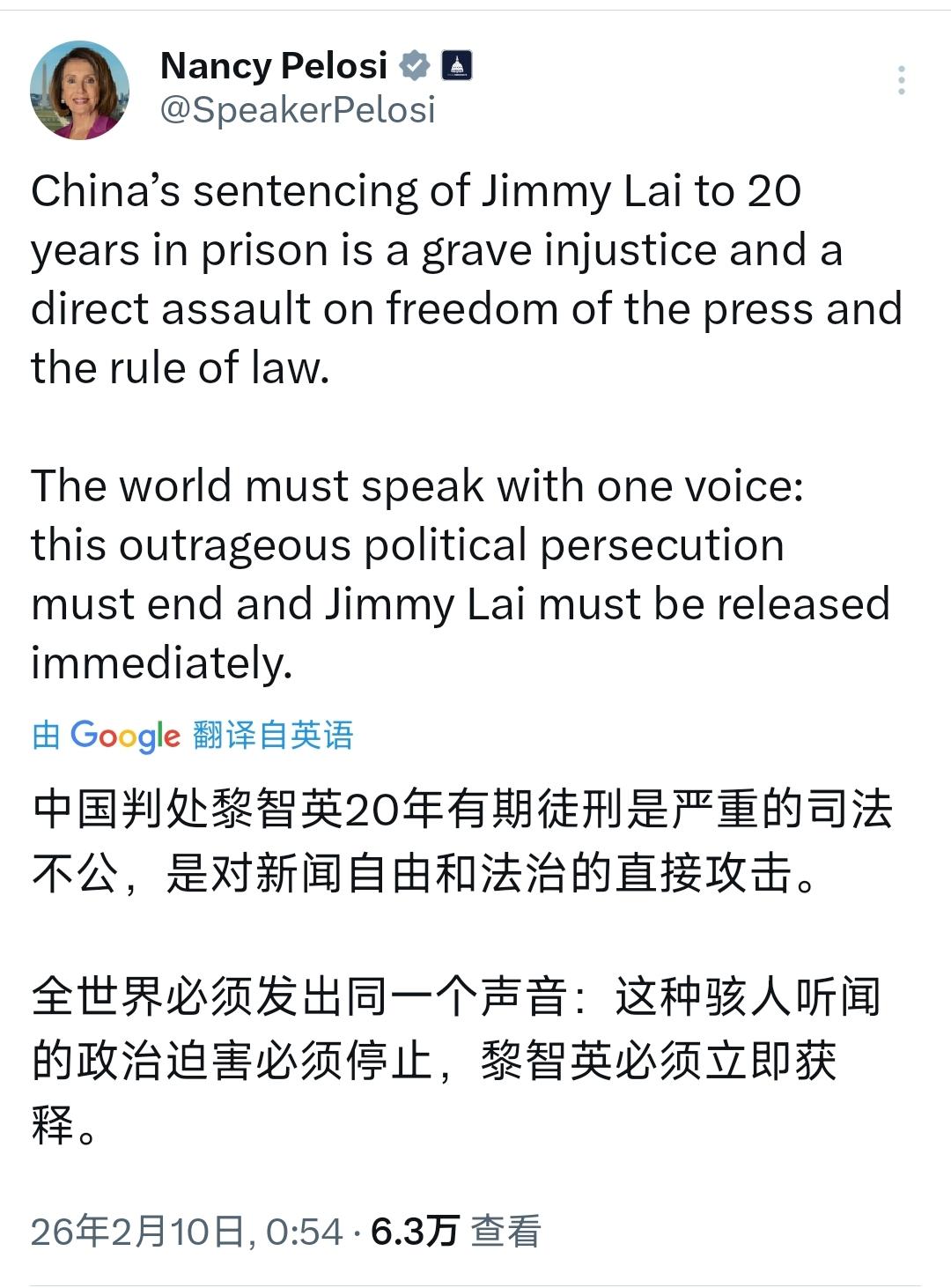 美国前众议长佩洛西今天(北京时间2月10日)发文叫嚣道:“中国判处黎智英20年有期徒刑是严重的司法不公,是对新闻自由和法治的直接攻击。全世界必须发出同一个声音:这种骇人听闻的政治迫害必须停止,黎佩英必须立即获释。” 这段话一出来,很快就引发了不少人的关注和讨论。其实明眼人都能看出来,佩洛西这番话根本不是什么公正的评判,更像是带着偏见的刻意指责,说白了就是在干涉中国的内部事务。 黎智英被判刑,是中国司法机关经过严密审理、依法作出的判决,全程都遵循着法治原则,每一个环节都经得起推敲和检验,根本不存在所谓的“司法不公”和“政治迫害”。 佩洛西连案件的具体情况都没弄清楚,就随意给中国司法贴上负面标签,这种做法本身就很不严谨,也很不负责。 她还拿“新闻自由”说事,把黎智英塑造成一个因为坚持新闻自由而被迫害的无辜者。 可实际上,新闻自由从来都不是无底线的,不管是什么职业,不管打着什么旗号,都不能触碰国家安全的红线,这是每个国家都有的底线和原则。 黎智英的问题,从来都不是简单的“写文章”那么简单,他背后涉及勾结外部势力、危害中国国家安全的行为,证据确凿,这也是他被判刑的根本原因。 再说了,美国自己也有一套严苛的国家安全法律,只要有人触碰国家安全的底线,美国政府从来都是重拳出击,从不手软。 可到了中国这里,中国依法维护国家安全、惩治违法分子的行为,就被佩洛西说成是“骇人听闻”,这明显就是双重标准,典型的“只许州官放火,不许百姓点灯”。 而且佩洛西本人,也不是什么真正关心法治和自由的人。 她之前不顾中国的强烈反对,执意窜访中国台湾地区,干涉中国内政,还长期给乱港分子撑腰,这些行为本身就破坏了地区的和平稳定,也违背了法治精神。 现在她却站在道德高地上,对中国的司法事务指手画脚,实在是让人觉得讽刺。 说到底,佩洛西这时候跳出来发文,根本不是出于什么正义之心,更多的是出于地缘政治的考量,想借着黎智英的案子制造舆论噪音,干扰中国的发展。 可她显然打错了算盘,中国维护国家安全和司法主权的决心和立场,从来都不会因为外部的指责和干扰而动摇。 黎智英被判刑,是他违法犯罪应得的下场,也是中国法治力量的体现,外部势力再怎么叫嚣、再怎么抹黑,都改变不了事实真相。 大家对此怎么看?欢迎评论区留下您的观点!
