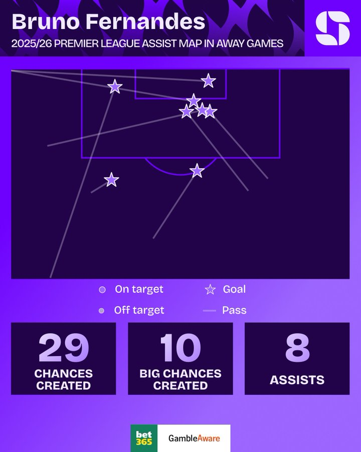 虎扑02月10日讯根据Squawka的统计,布鲁诺-费尔南德斯本赛季已经在英超客场送出了8次助攻,这追平了吉格斯在2001/02赛季所创造的曼联队史纪录。