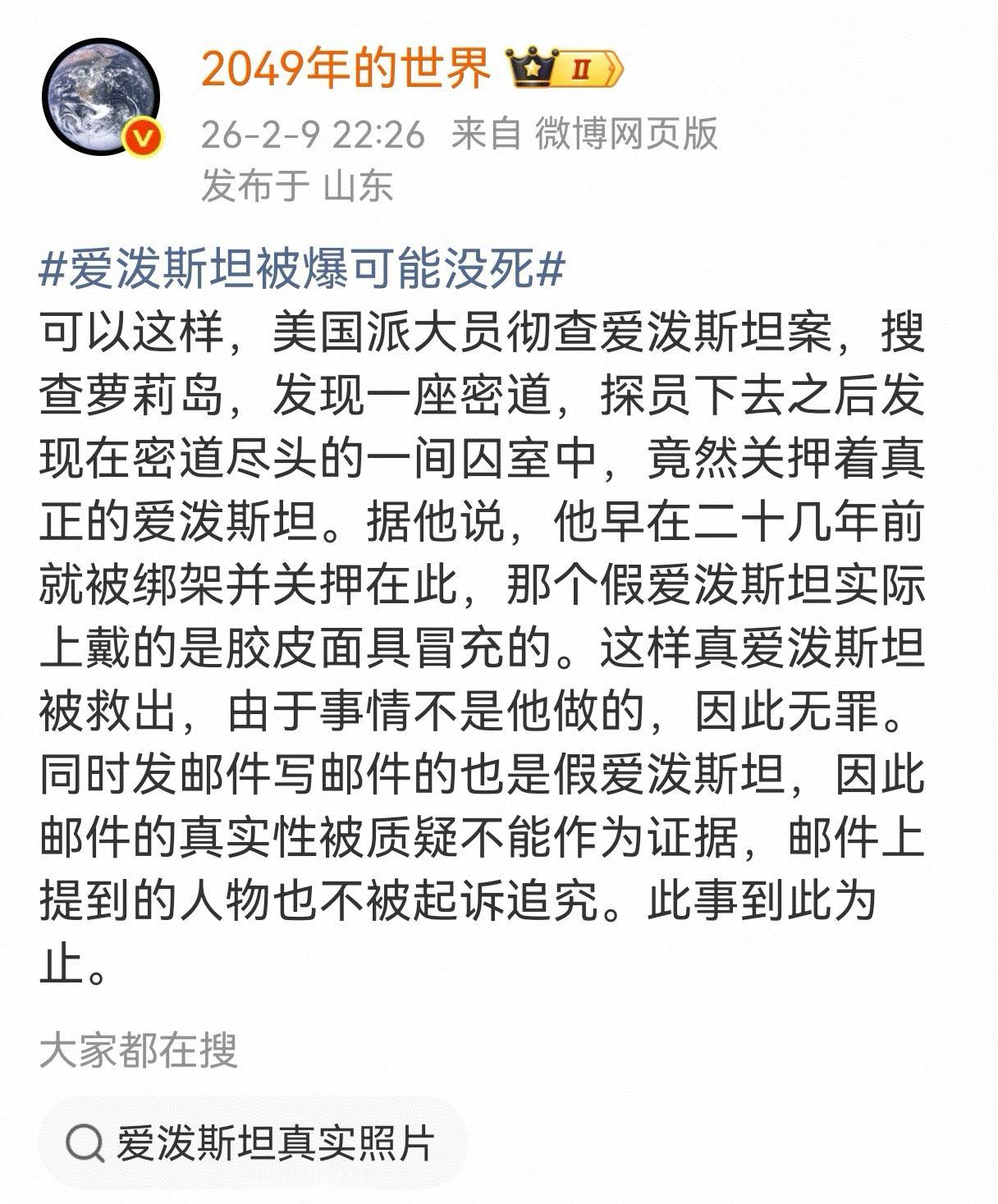 这个博主猜得有几分道理,但存在另外一种可能:那就是爱泼斯坦在第二次入狱的时候已经用替身顶了包,即真的爱泼斯坦已经找到一个更隐秘的小岛,重新再建了一个小岛,换了一个名字,继续在经营从前的营生,继续在为顶级权贵服务。而进入监狱的假爱泼斯坦在入狱后一个月,自杀了。前面的爱泼斯坦案用替身完成了“赎罪”,GAME OVER。新的游戏还在继续,新瓶装旧酒,歌照唱舞照跳,但可能顶级权贵的名单换了一些,比如克林顿肯定没有资格再登新岛,说不定马斯克是新岛的红人。