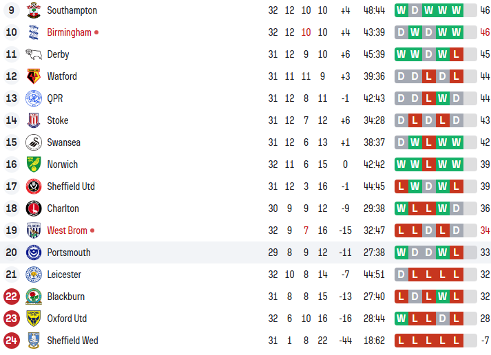 被扣除6个积分后,莱斯特城目前和降级区的布莱克本同积32分。