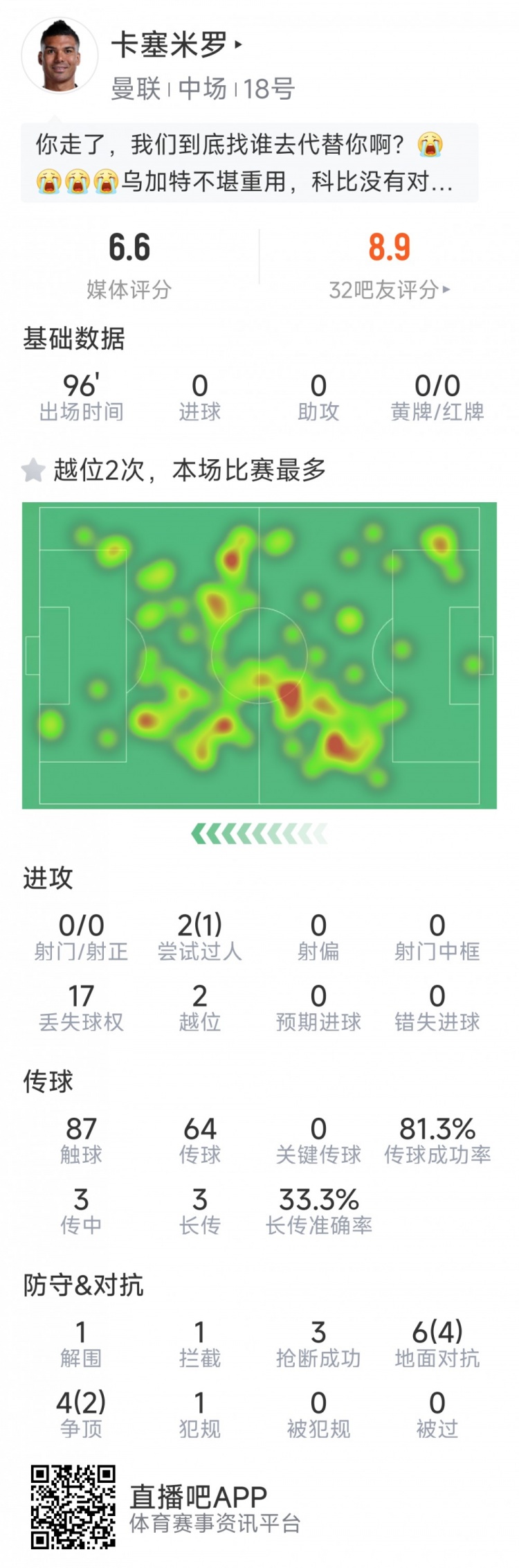 直播吧2月11日讯在本轮英超,曼联1-1战平西汉姆,卡塞米罗进球被吹无效,以下为他在本场数据:
