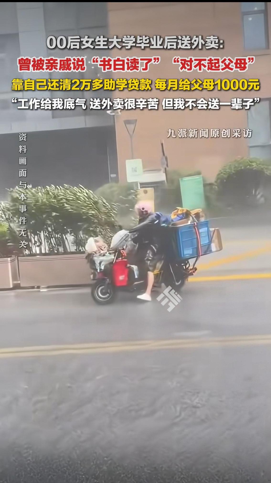 00后女生送外卖被骂“书白读了”:她用一双手,活成了最硬的底气 那些嚼舌根的亲戚大概想不到,被他们嘲讽“没出息”的女孩,正用最朴素的劳动,改写着自己的人生。 刚毕业时,她挤过招聘会、投过无数简历,现实却给了她一记闷棍。没有背景、没有退路,助学贷款像一座小山压在肩头,父母在老家操劳,身体不好还没有退休金。与其在家啃老、伸手要钱,不如穿上工装、骑上电动车,用汗水换一份踏实收入。 风里来雨里去,爬楼梯、赶时间、忍委屈,送外卖的苦,她咬着牙全扛了下来。每月七八千的收入,她省吃俭用,把开销压到最低,一分不少还清2万多助学贷款,没花家里一分钱;每月雷打不动给父母转1000元,用行动撑起小家的安稳。 亲戚们的冷嘲热讽从未停过:“读大学有什么用,还不是送外卖”“对不起父母的培养”。可他们看不见,女孩深夜收工后复盘路线、规划时间的认真;看不见她把每一笔钱都花在刀刃上的清醒;更看不见,这份工作给她的,是不依附任何人的独立与底气。 读书的意义,从不是一张坐办公室的“通行证”,而是让人拥有直面困境的勇气、选择生活的能力,和靠自己站稳脚跟的骨气。她从不说大话,只默默用行动证明:靠双手吃饭,不丢人;自食其力的人生,最体面。 她很清楚,送外卖很辛苦,但绝不会送一辈子。这只是她人生的中转站,不是终点站。眼下的每一次奔波、每一笔积蓄,都是在为未来铺路。 真正丢人的,从不是职业高低,而是站在道德制高点随意评判他人的狭隘;真正的优秀,也不是活成别人眼中的“标准答案”,而是活成自己的靠山。 这个00后女孩,没有惊天动地的壮举,却用最踏实的选择,戳中了无数普通人的共鸣。不躺平、不抱怨、不认输,这样的年轻人,值得所有尊重。 你觉得,大学毕业送外卖,真的是“书白读了”吗?评论区说说你的看法。外卖员女孩 送外卖女生