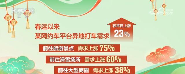道路出行方面,短途异地出行,打车需求旺盛。某网约车平台异地打车需求较平日上涨23%,其中前往旅游景点、滑雪场所和大型商圈的需求分别上涨75%、60%和38%。
