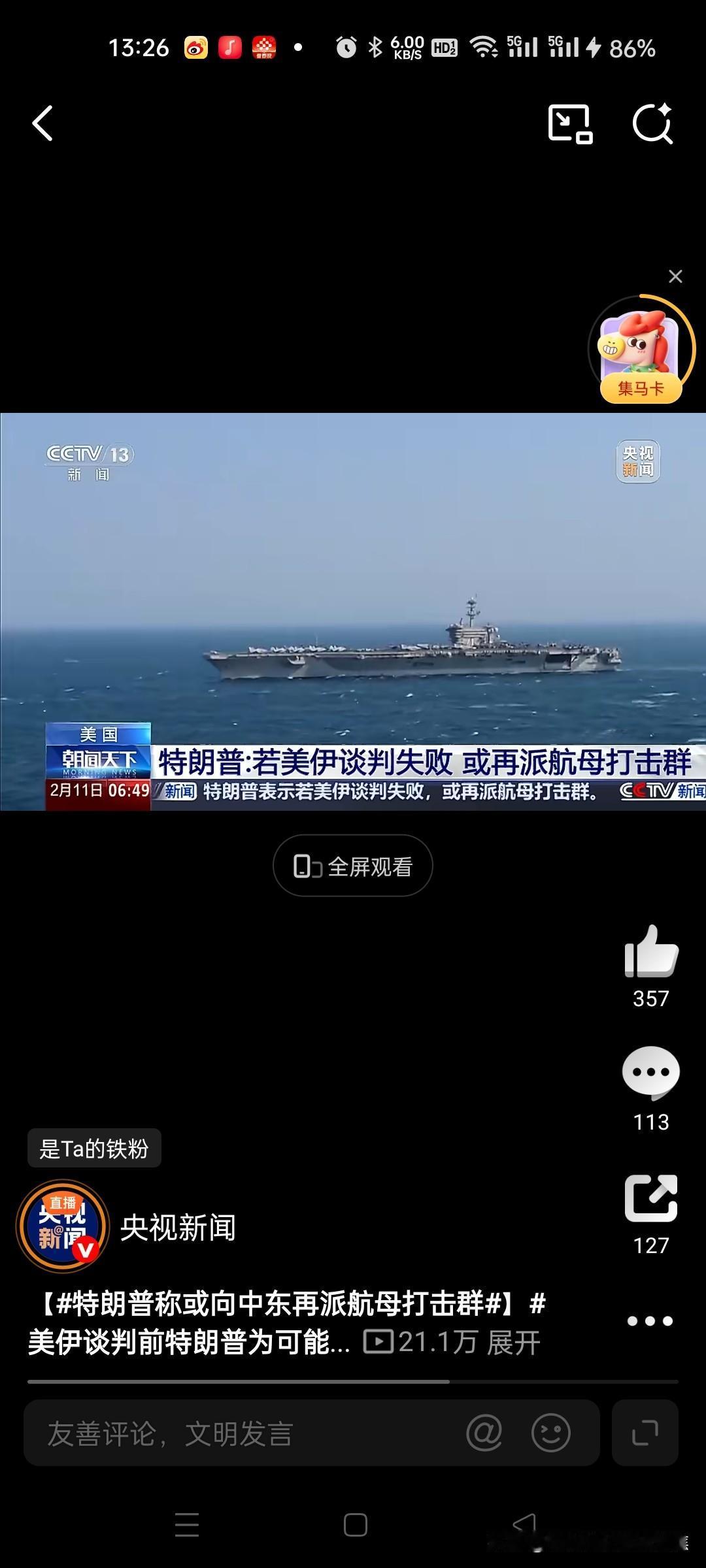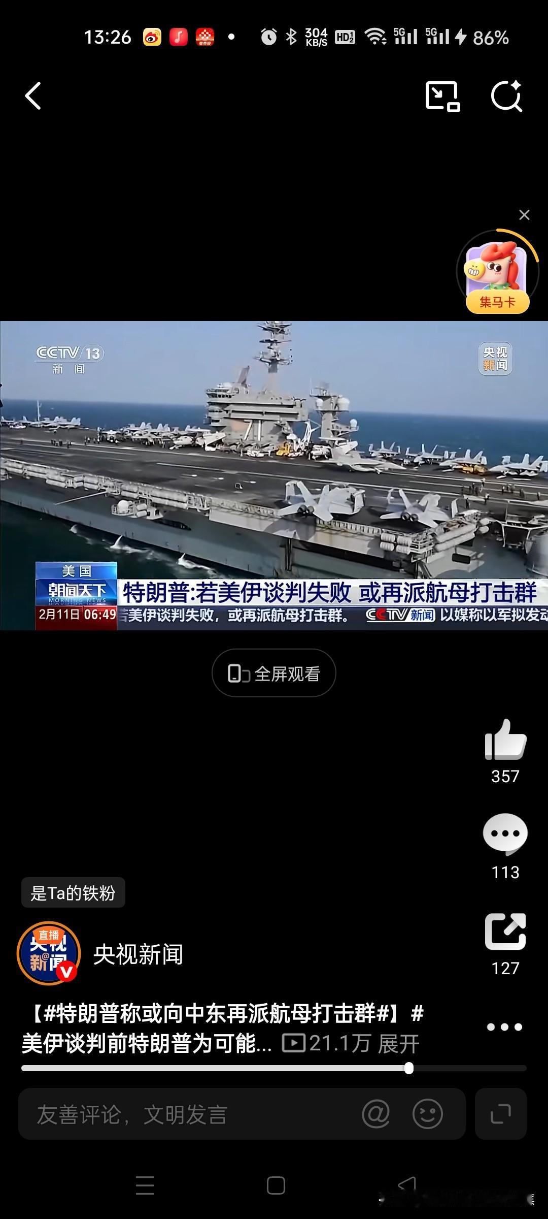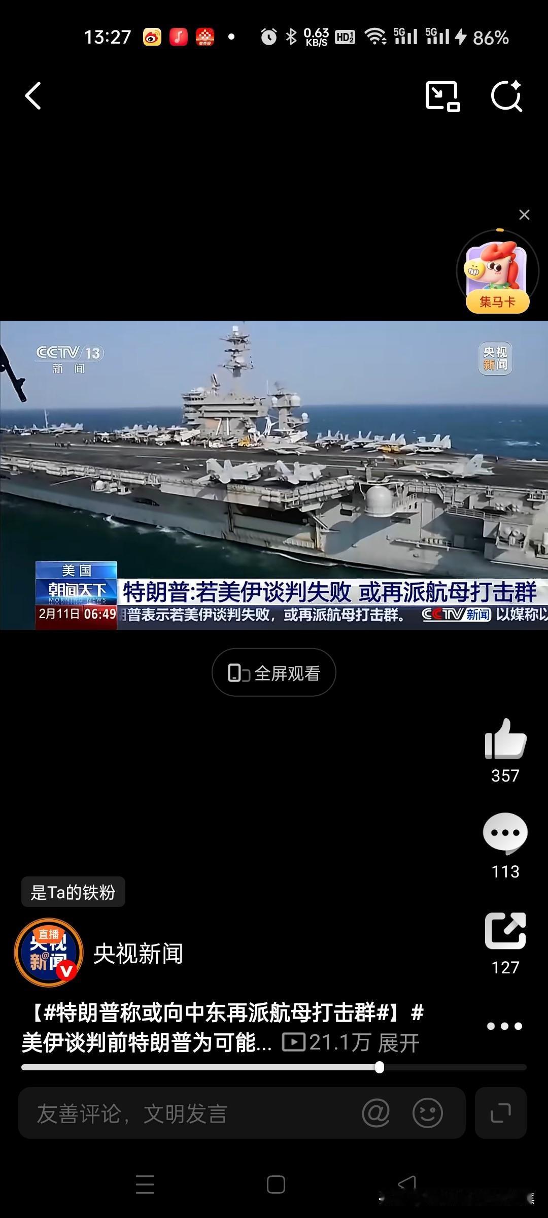 美国中东兵力不够,再派航母战斗群 美国总统特朗普于当地时间2月10日公开表示,若美伊谈判破裂,他将考虑向中东增派第二支航母打击群以强化军事威慑。 一、核心事实与最新动态 增派航母计划:特朗普在接受采访时证实,若与伊朗的谈判未能达成协议,美国可能向中东增派第二支航母打击群。目前该地区已部署“亚伯拉罕·林肯”号航母及其打击群,配备战斗机、巡航导弹等武器。美国政府内部已讨论过增派可能性。@央视新闻39 谈判时间表:特朗普预计美伊下一轮谈判将于下周进行,并强调任何协议必须同时涵盖伊朗核计划和弹道导弹问题。他声称伊朗“非常渴望达成协议”,但未排除军事选项。@人民日报18央视新闻 二、谈判背景与军事部署 当前局势紧张点: 伊朗强硬回应:伊朗外长明确表示“谈判不接受威胁”,武装部队已做好反击准备;伊媒甚至发布AI模拟打击美军航母的视频,展示无人机、导弹等多波次攻击手段。@CCTV国际...7 美以协调行动:以色列总理内塔尼亚胡于2月11日访美讨论伊朗问题,以方警告若伊朗越过“红线”,可能单方面发动打击。89 美军现有部署: 中东现有至少10艘美军舰艇,包括“林肯”号航母和“阿利·伯克”级驱逐舰等。@央视财经 美军在中东拥有4万至5万名驻军及多个基地,可为空袭、海上封锁等行动提供支撑。@央视网15央视新闻CCTV国际时讯央视财经央视网 三、战略意图与潜在行动 “性价比”考量:专家分析指出,美军对伊朗动武的军事技术准备已就绪,但特朗普政府纠结于行动成本,倾向效仿此前对委内瑞拉和伊朗核设施的“速战模式”(24小时内结束),力求以最小成本施压。@北京日报5 军事选项范围:备选方案包括象征性打击、长期封锁、网络攻击,甚至联合以色列轰炸伊朗革命卫队设施。615央视网 四、各方反应与风险预警 地区盟友态度:海湾国家如沙特拒绝向美军提供领空和基地支持,且美国未向其通报具体军事计划。@参考消息 全球市场波动:特朗普威胁加剧地缘风险,国际油价与黄金价格应声波动,但未形成单边趋势。@财联社APP 特朗普此番表态既是对谈判的施压手段,也反映了其在军事与外交间的摇摆立场,中东局势短期仍将处于高风险僵持状态。159参考消息