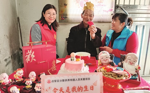 2025年4月,宜昌市点军区民政局委托第三方服务机构,联合村委会、志愿者在土城乡高岩村为分散供养特困人员开展“今天是我的生日”关爱活动。
