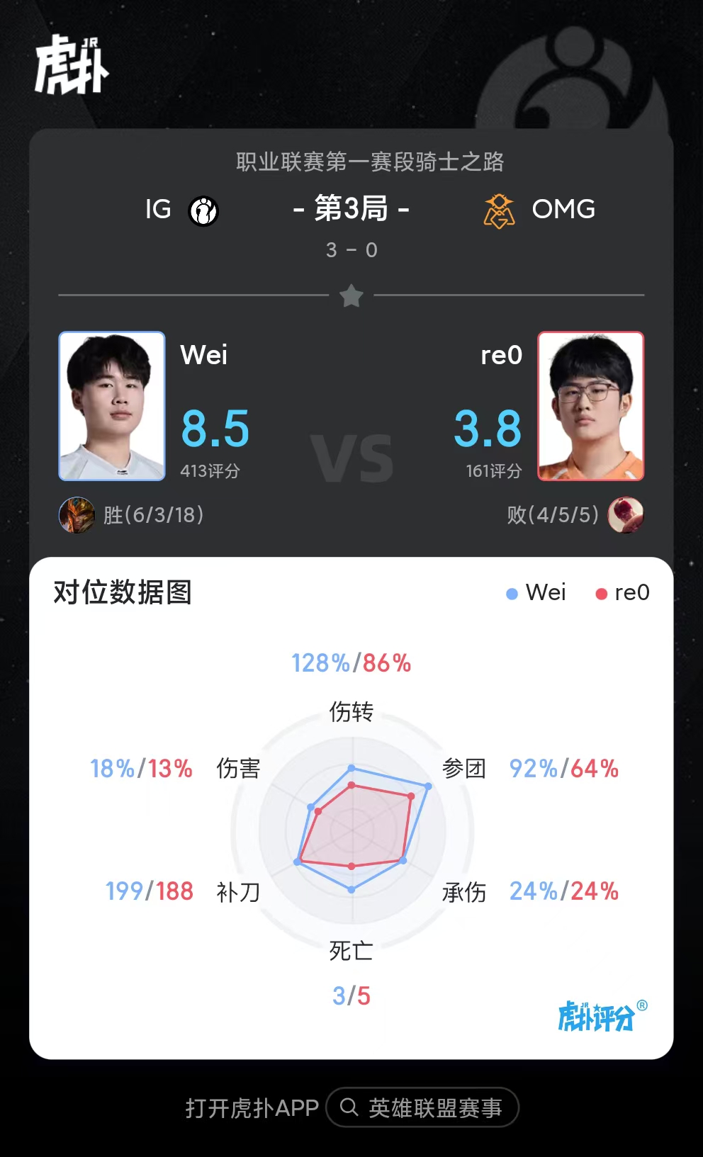 虎扑02月11日讯Wei皇子打出6/3/18战绩,拿到IG对阵OMG第三局比赛MVP