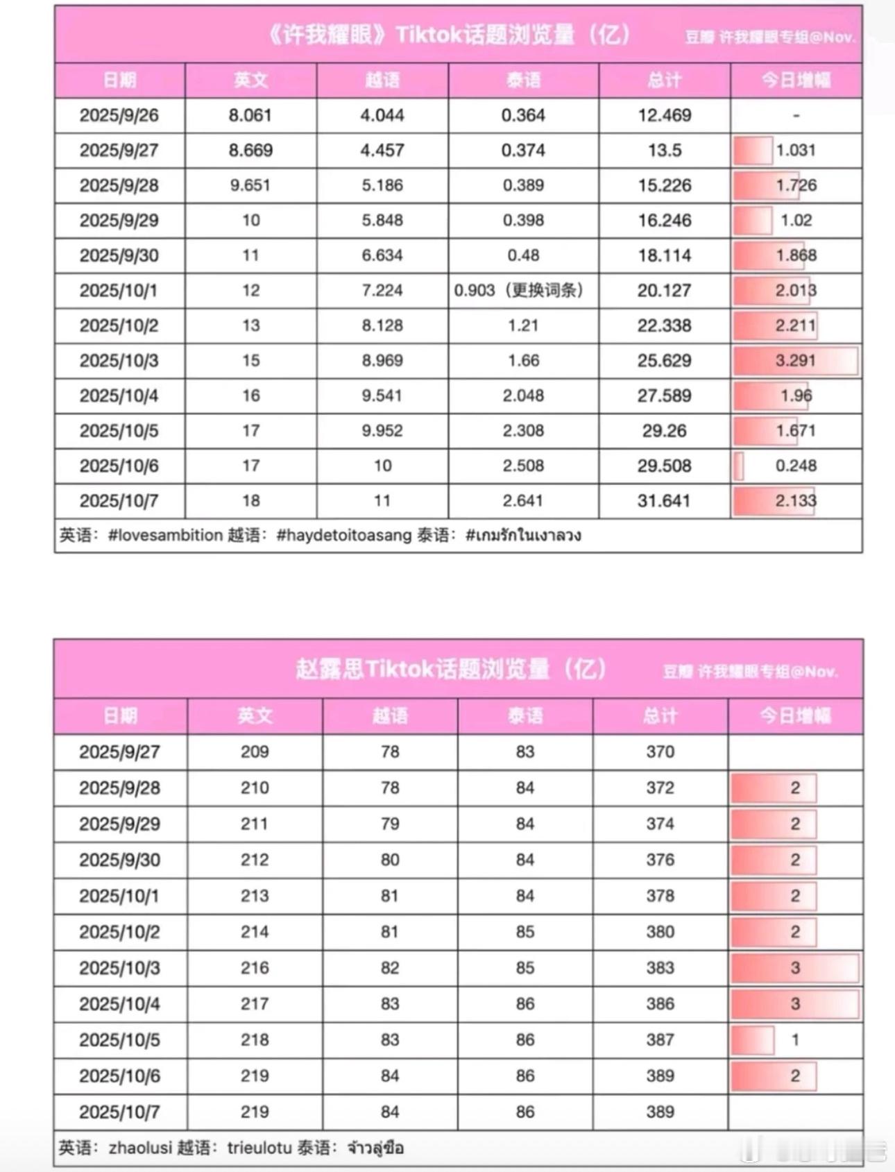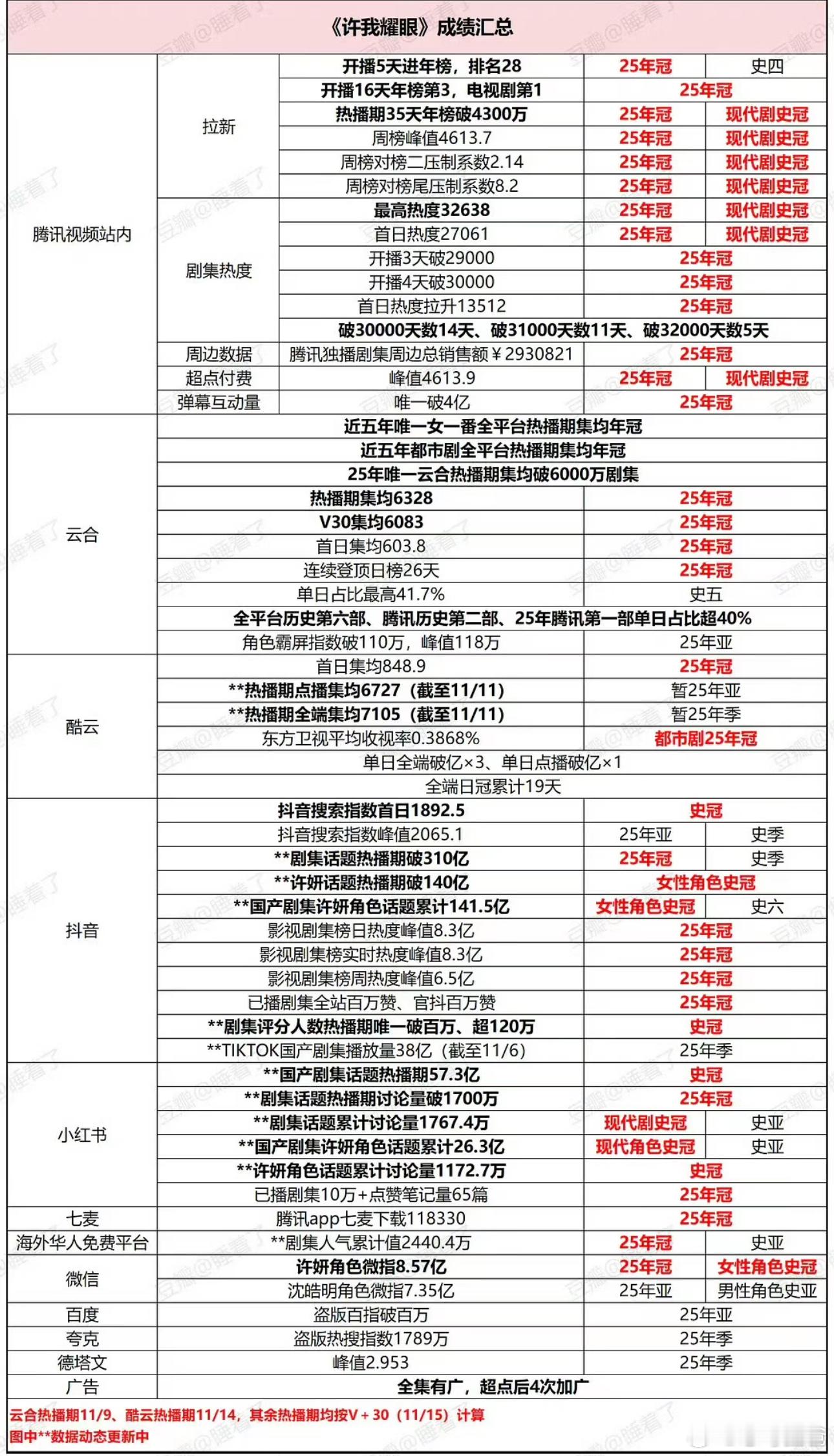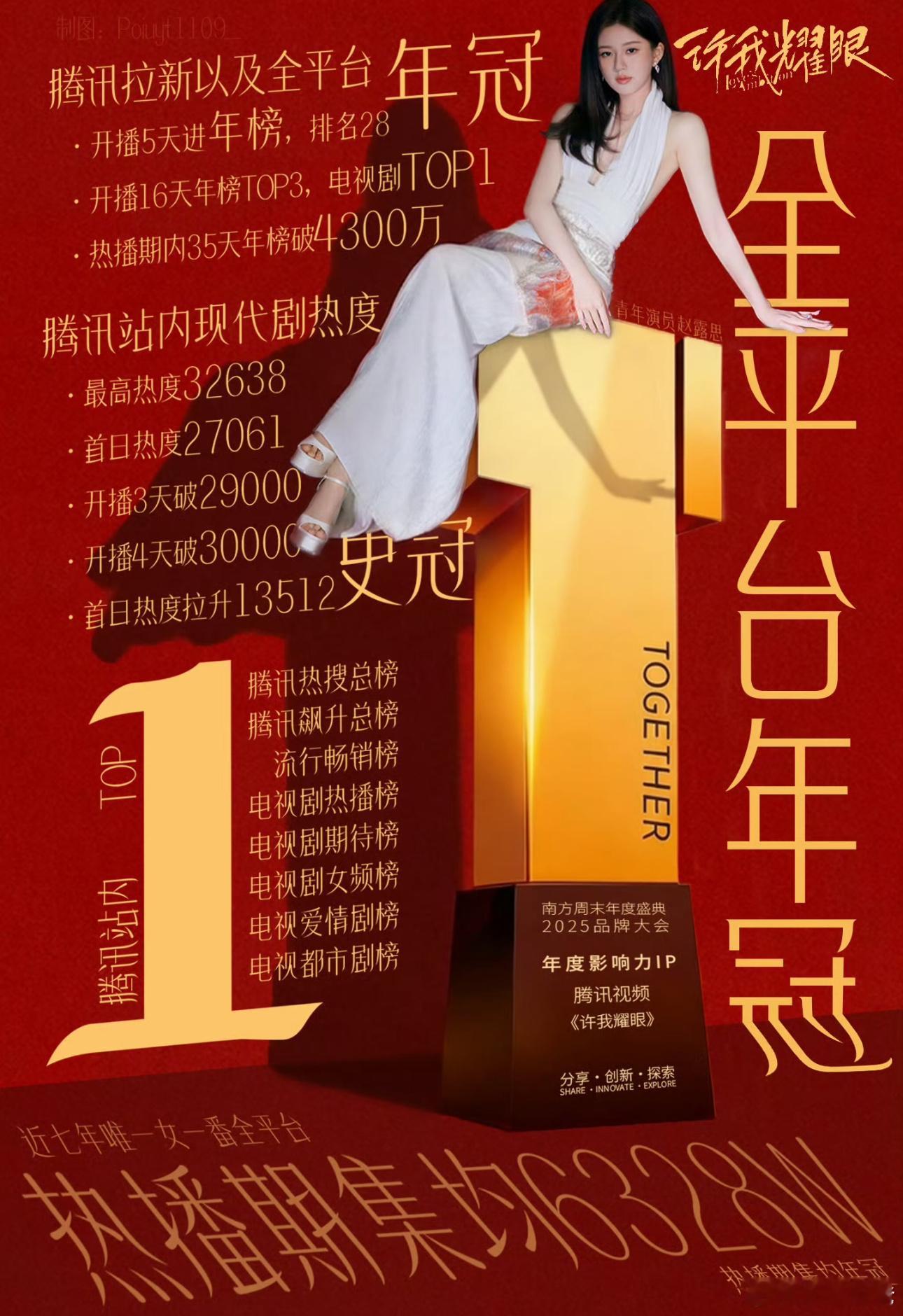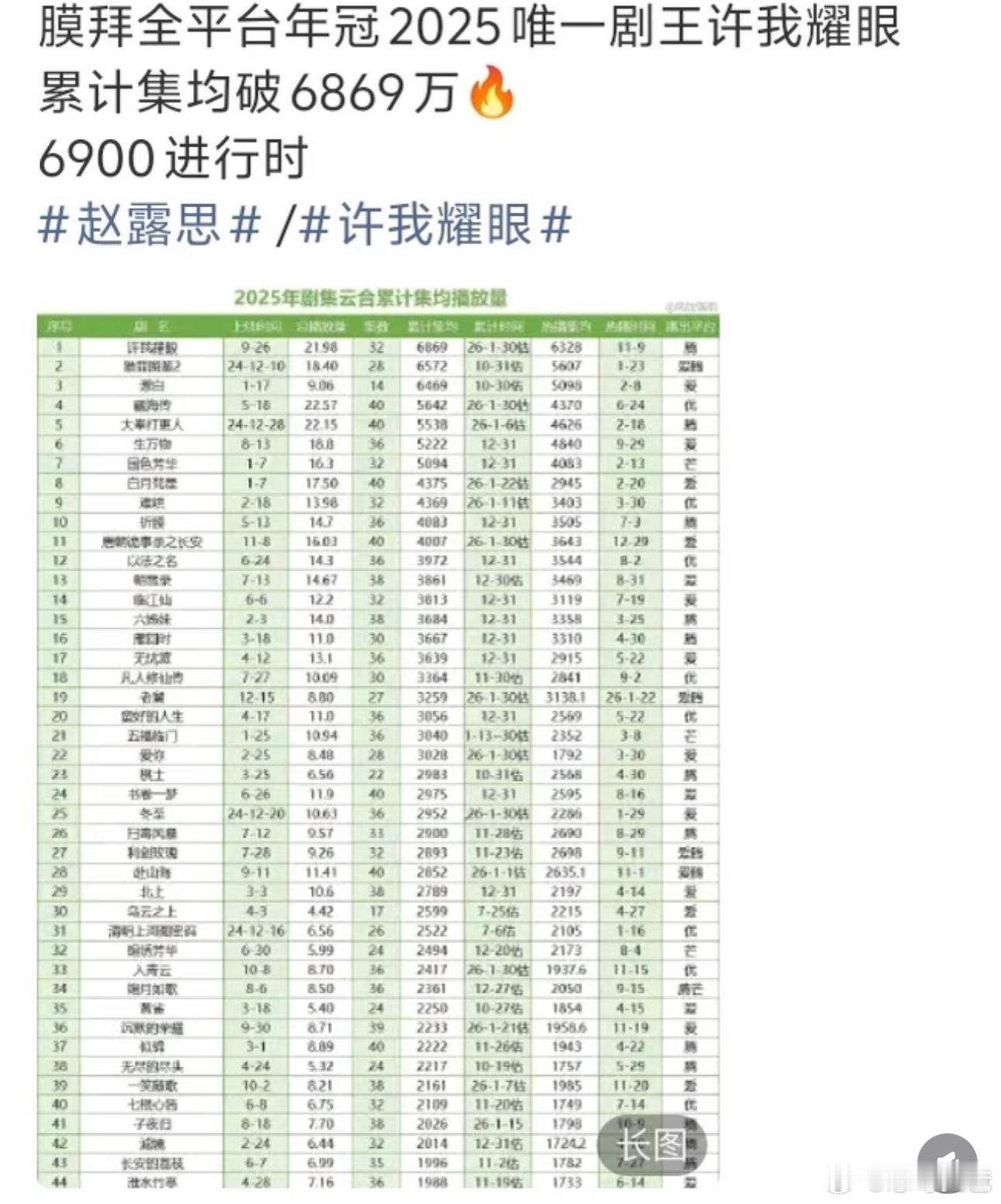 作为2025第一真现象级大爆剧许我耀眼一直都在交出精彩的答卷 恭喜赵露思《许我耀眼》灯塔全网播放破20亿‼️‼️这部剧自从首播就热度不断,先后登上了20个海外腾讯的热播第1️⃣海外tiktok不断飞速上涨。与此同时云合最新统计到了累计集均6869w 7000万指日可待。图一说的非常好,跟许我耀眼比数据纯属找虐,可以这么说从许我耀眼可以从25年打到26年