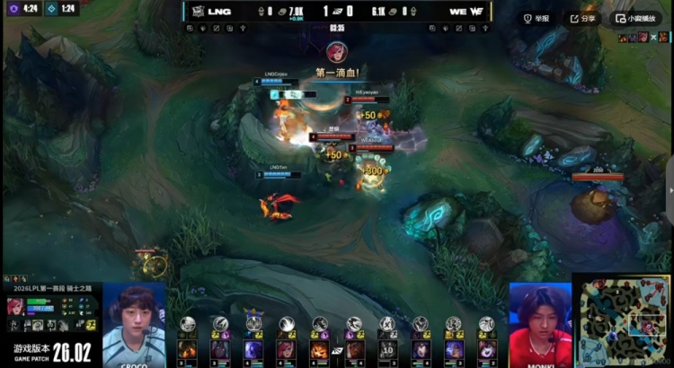 [3:35]双方争夺蓝BUFF,LNG第一时间集火强杀Monki皇子让Croro蔚拿下一血,但是支援多个人的WE也留住了MISSING泰坦!双方1换1!