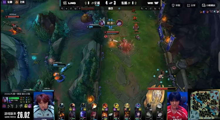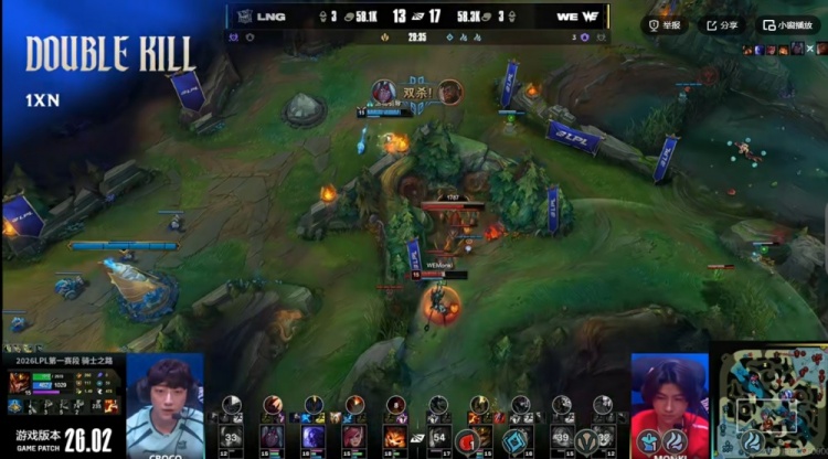 [26:02]Croco蔚侧翼Q璐璐进场锁头C位但是队友被一个皇子盖大隔开了啊!Croco蔚先白给!后续团战sheer大纳尔拍回两个配合队友秒掉了About芸阿娜!但是自己也被换掉!WE打出1换3,拆掉了LNG中一塔!WE领先3K多了!
