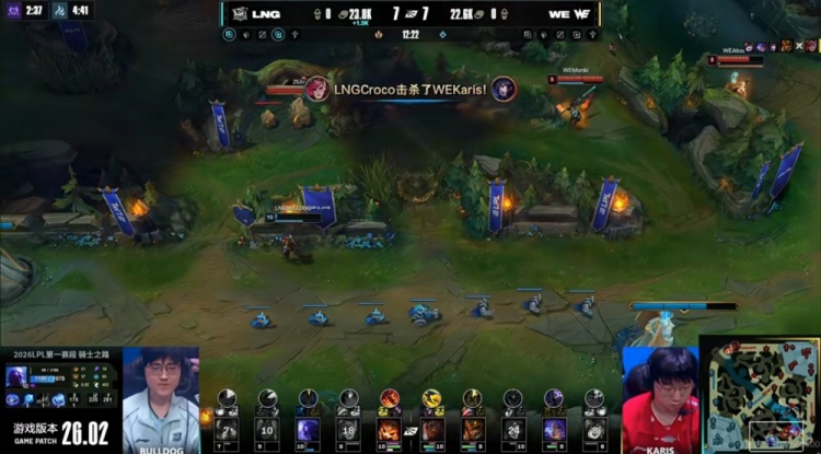 [22:32]WE三人包上,强杀掉了sheer纳尔!顺势拍大龙逼团但失败!LNG拆掉中一塔但是Croco蔚去单人反F6之后白给了!这样LNG没打野了啊!多个打野的WE顺势拿下听牌龙!