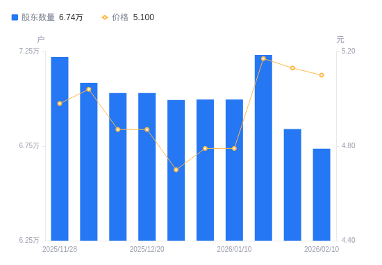 日期A股户数(户)流通A股户均持股数(股)户均持股市值(万元)2026-02-106735915581.097.952026-01-306840515342.847.872026-01-207231714512.877.502026-01-106996715000.317.192026-01-096996715000.317.192025-12-316993815006.537.052025-12-207030214928.837.272025-12-197030214928.837.272025-12-107084314814.837.472025-11-287220414535.587.24