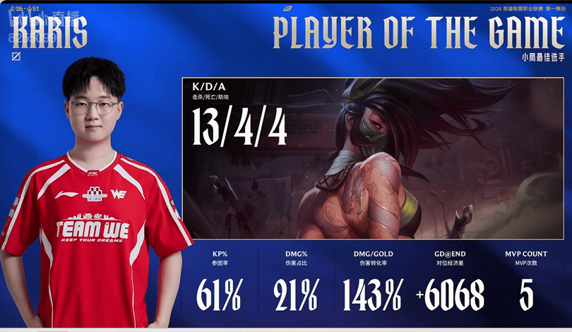 Karis阿卡丽打出13/4/4战绩,拿到WE对阵LNG第四局比赛MVP