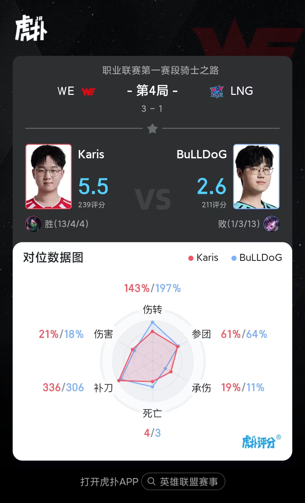 虎扑02月11日讯Karis阿卡丽打出13/4/4战绩,拿到WE对阵LNG第四局比赛MVP
