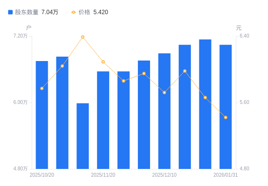 日期A股户数(户)流通A股户均持股数(股)户均持股市值(万元)2026-01-317043816143.568.752026-01-207139415927.399.012026-01-097043816143.569.652025-12-106889216505.839.442025-11-306758916824.0410.012025-11-216562517327.5410.152025-11-206562517327.5410.552025-11-105987318992.2012.142025-10-316828616652.3110.062025-10-206749816846.729.72