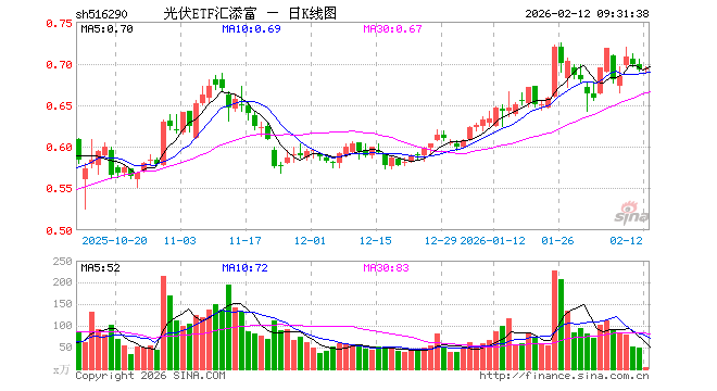 2月12日,光伏ETF汇添富(516290)开盘涨0.00%,报0.692元。光伏ETF汇添富(516290)重仓股方面,特变电工开盘涨0.90%,隆基绿能涨0.00%,阳光电源跌0.07%,TCL科技跌0.21%,通威股份涨0.00%,迈为股份跌0.34%,德业股份涨0.00%,正泰电器涨0.13%,TCL中环跌1.00%,捷佳伟创跌0.67%。