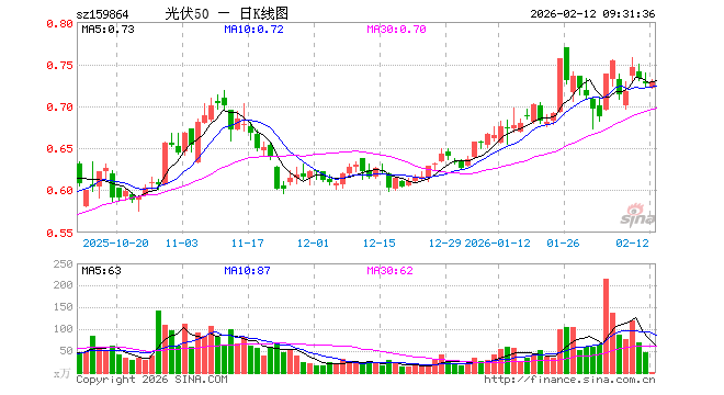 2月12日,光伏ETF国泰(159864)开盘跌0.69%,报0.721元。光伏ETF国泰(159864)重仓股方面,特变电工开盘涨0.90%,隆基绿能涨0.00%,阳光电源跌0.07%,TCL科技跌0.21%,通威股份涨0.00%,迈为股份跌0.34%,德业股份涨0.00%,正泰电器涨0.13%,TCL中环跌1.00%,捷佳伟创跌0.67%。