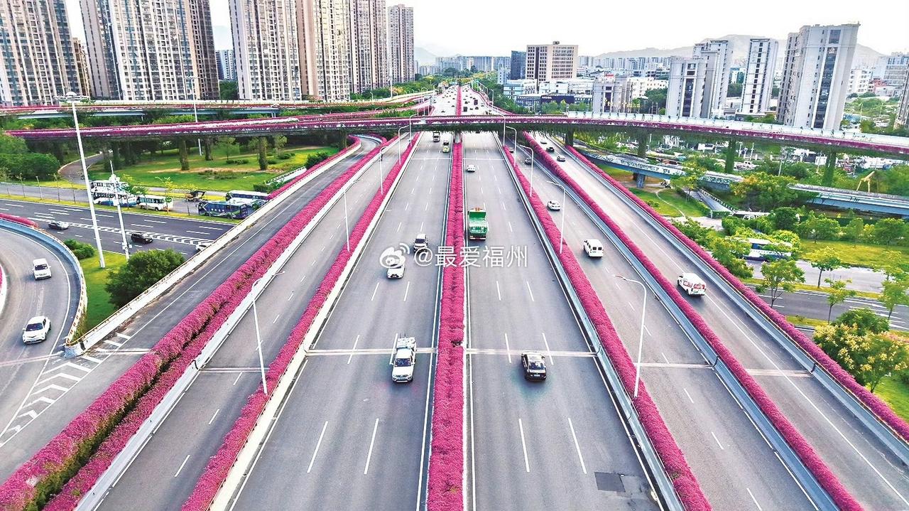 福州国货互通高架桥三角梅“换盆” 高架桥上的三角梅花带扮靓榕城,成为福州的一张“城市名片” via最爱福州