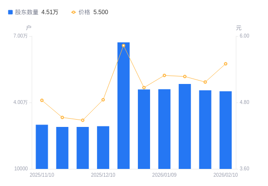 日期A股户数(户)流通A股户均持股数(股)户均持股市值(万元)2026-02-10450839304.865.122026-01-30454949220.804.772026-01-20483888669.324.572026-01-09460279114.024.822025-12-31459099137.454.632025-12-19672156241.033.642025-12-102930014317.106.942025-11-282897414478.196.492025-11-202897014480.196.562025-11-102997313995.636.77