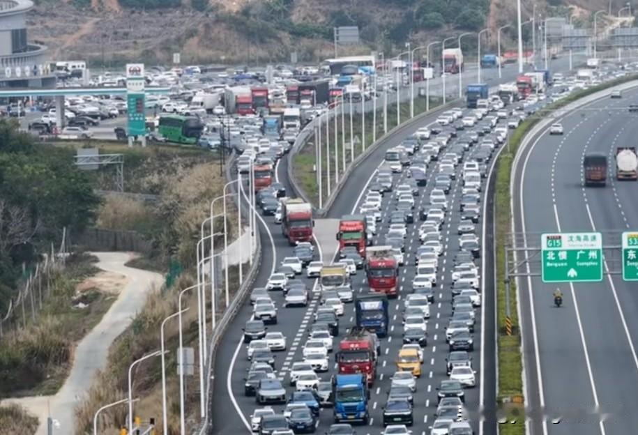 沈海高速广东阳江段。东西方向的车流巨大悬殊形成了鲜明的对比。前几年沈海高速经过了升级改造,成了双向八车道的高速公路。但在春节这些节假日来临之际,还是被庞大的返乡大军给填满了。这场面真是相当壮观,也体现了现在我国汽车保有量的庞大。