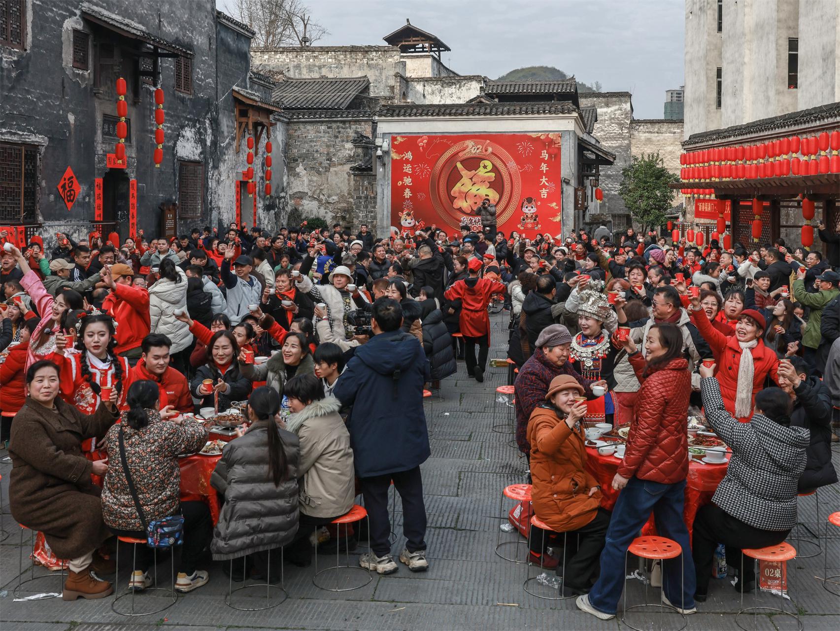 2月11日,南方小年,湖南洪江古商城留园人声鼎沸,40张大圆桌整齐排列,“洪福洪江年·小城过大年”系列活动“洪商福宴”举行,洪江古商城居民与各地游客欢聚一堂,在烟火气中品味洪江的年味与温情。