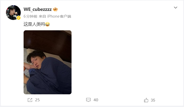 WE上单Cube刚刚分享了一张照片,他与老队友Shanks在同一张床上,Shanks睡眼惺忪