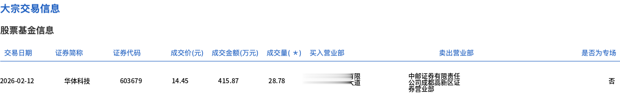 2月12日,华体科技大宗交易成交28.78万股,成交额415.87万元,占当日总成交额的6.58%,成交价14.45元,较市场收盘价15.98元折价9.57%。