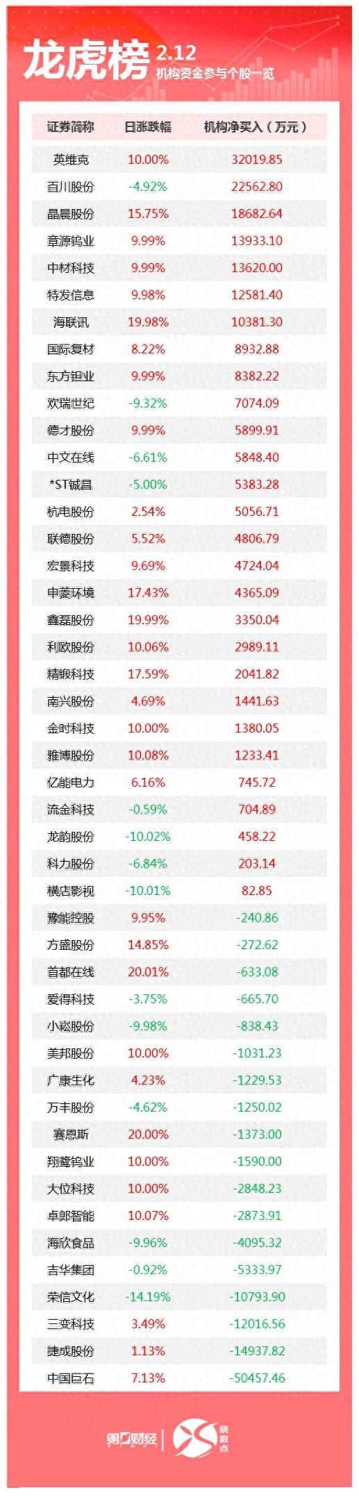 盘后数据显示,2月12日龙虎榜中,共46只个股出现了机构的身影,有28只股票呈现机构净买入,18只股票呈现机构净卖出。