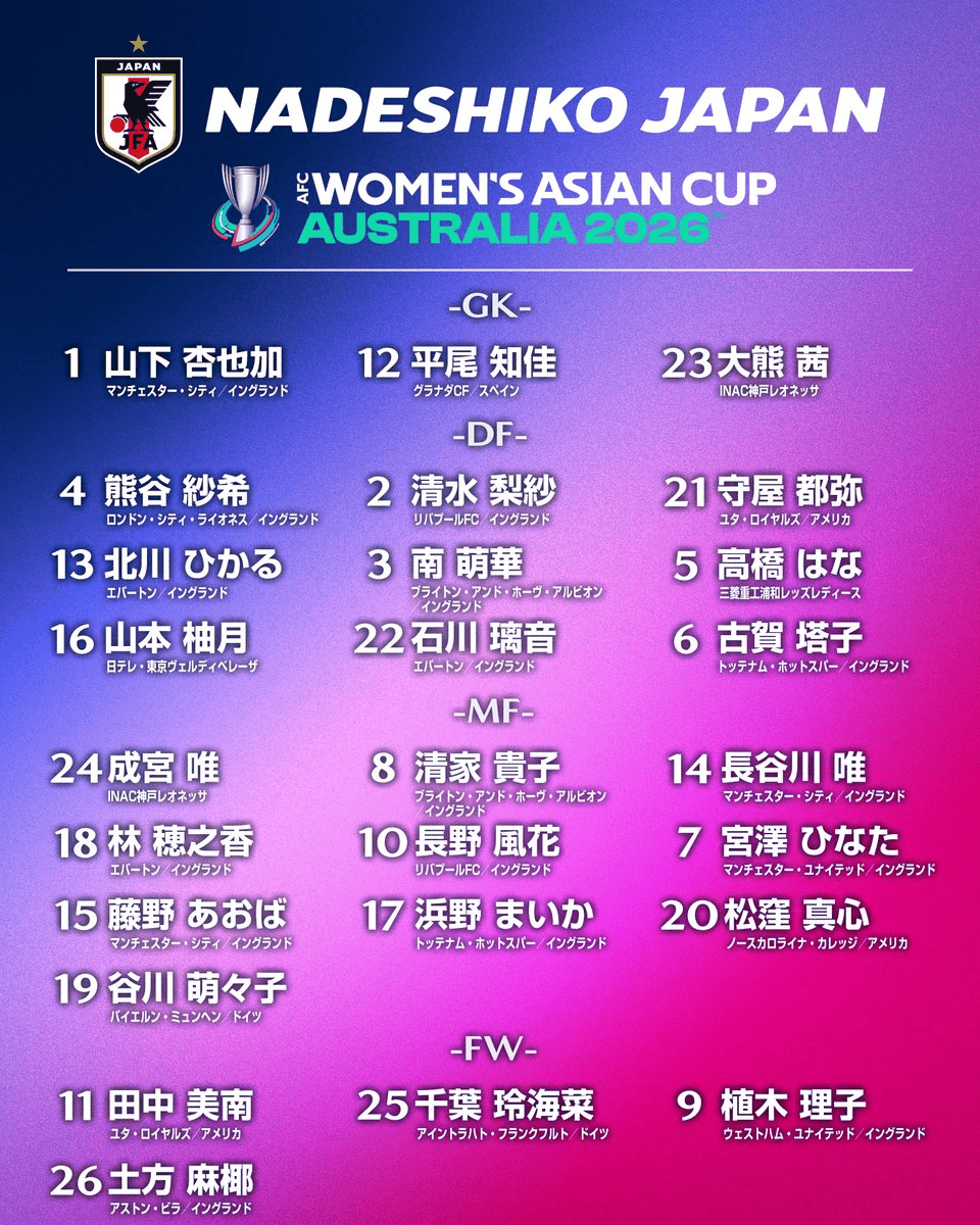 虎扑02月12日讯日本女足公布了亚洲杯大名单,26人中仅3人在国内联赛效力,其余全部留洋海外。