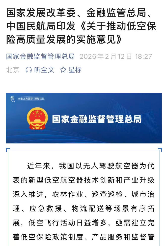 2月12日,国家发展改革委、金融监管总局、中国民航局对外发布了《关于推动低空保险高质量发展的实施意见》(以下简称《实施意见》)。