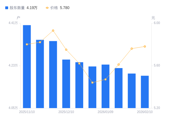 日期A股户数(户)流通A股户均持股数(股)户均持股市值(万元)2026-02-104186911922.286.892026-01-304196411895.296.852026-01-204219411830.456.642026-01-094234211789.106.452025-12-314226311811.146.432025-12-194244311761.046.612025-12-104255411730.376.742025-11-284334011517.636.832025-11-204339211503.836.702025-11-104401311341.516.58
