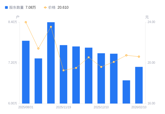 日期A股户数(户)流通A股户均持股数(股)户均持股市值(万元)2026-02-10707987155.7314.752026-01-20668417579.3515.722025-12-31746916781.8113.622025-12-10748276769.4813.272025-11-30764686624.2113.612025-11-20768376592.4012.862025-11-19772226559.5312.632025-09-30839816031.6014.202025-09-19733006910.5114.802025-08-31784986382.1115.31