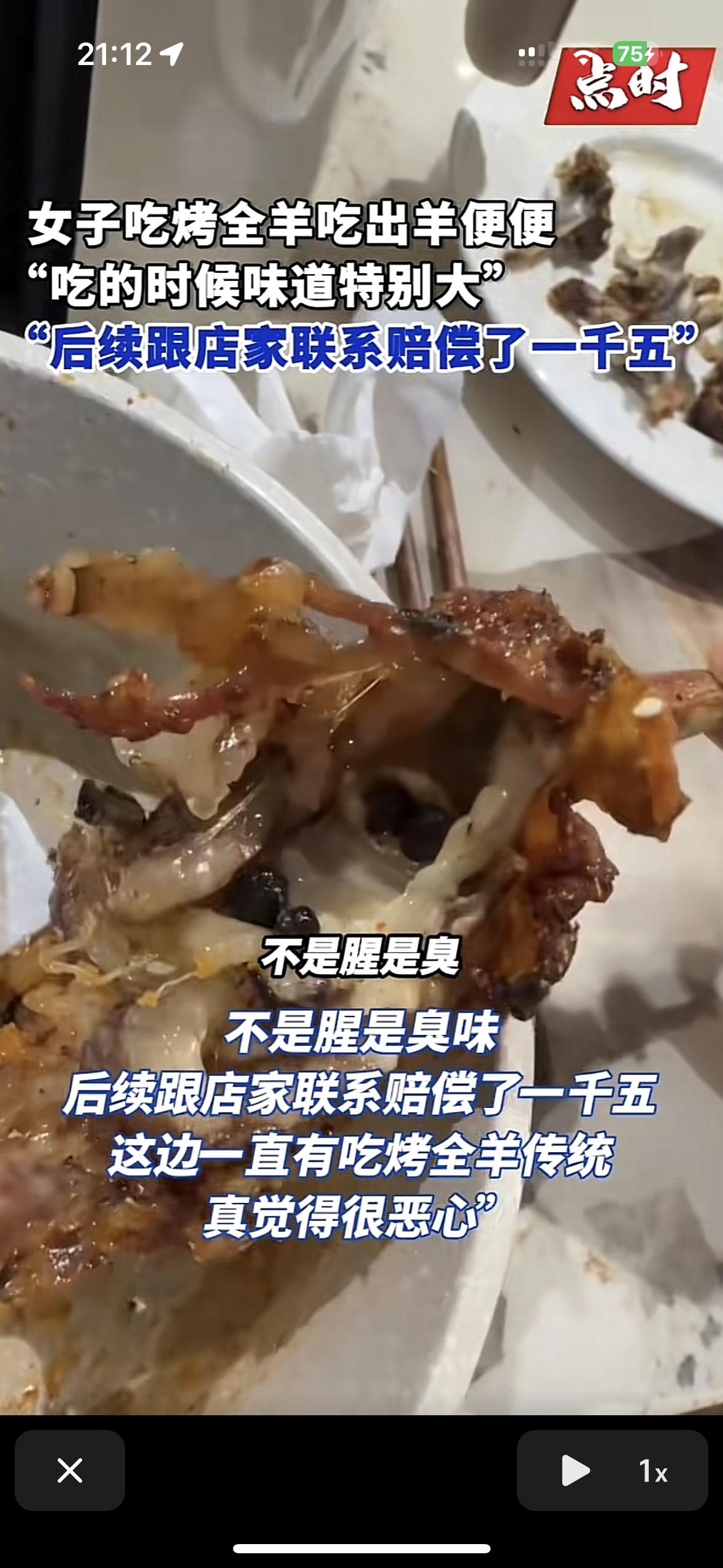 估计她这辈子都不想吃羊肉了! 1500元给你,让你吃个带味道的烤全羊,你愿意吗? 一女子在吃烤全羊的时候,在羊尾巴的部位吃出了羊粪蛋,那股子臭味,让她都有心理阴影了 她说吃的时候就觉得味道不对劲,不是普通的腥味,而是直冲脑门的臭味。一开始还没多想,吃到羊尾巴看到黑色的羊粪蛋的时候都想吐了 店家赔了1500,但真不多,换我这辈子都不想吃羊肉了!大家觉得给你1500你愿意吃顿带羊粪的烤全羊吗?